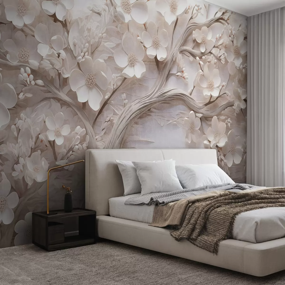 Fototapety Texturovaný strom s bílými květy a hnědým kmenem, pozadí je bílé s vodorovnými liniemi měkké osvětlení Č. w09166