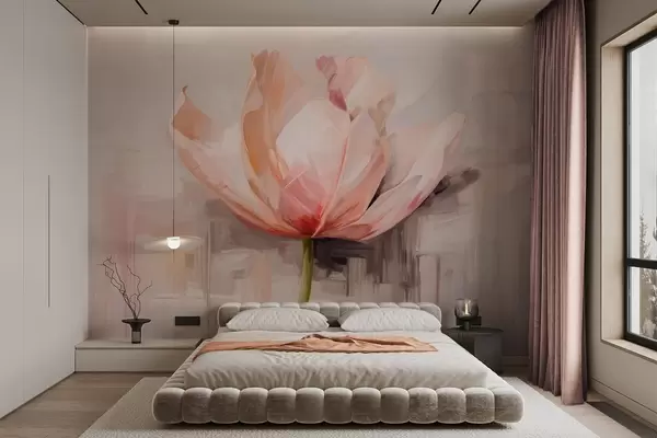 Fototapet Růžový tulipán, imitace olejomalby s jemnými tahy štětce, abstraktní pozadí s pastelovými odstíny šedé a béžové barvy w09187