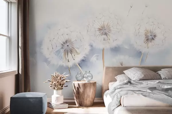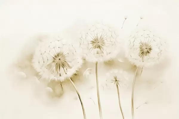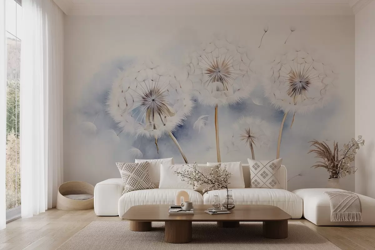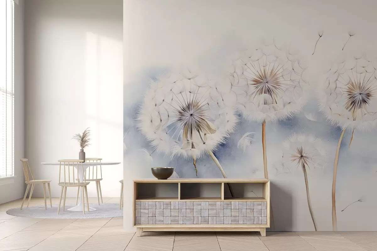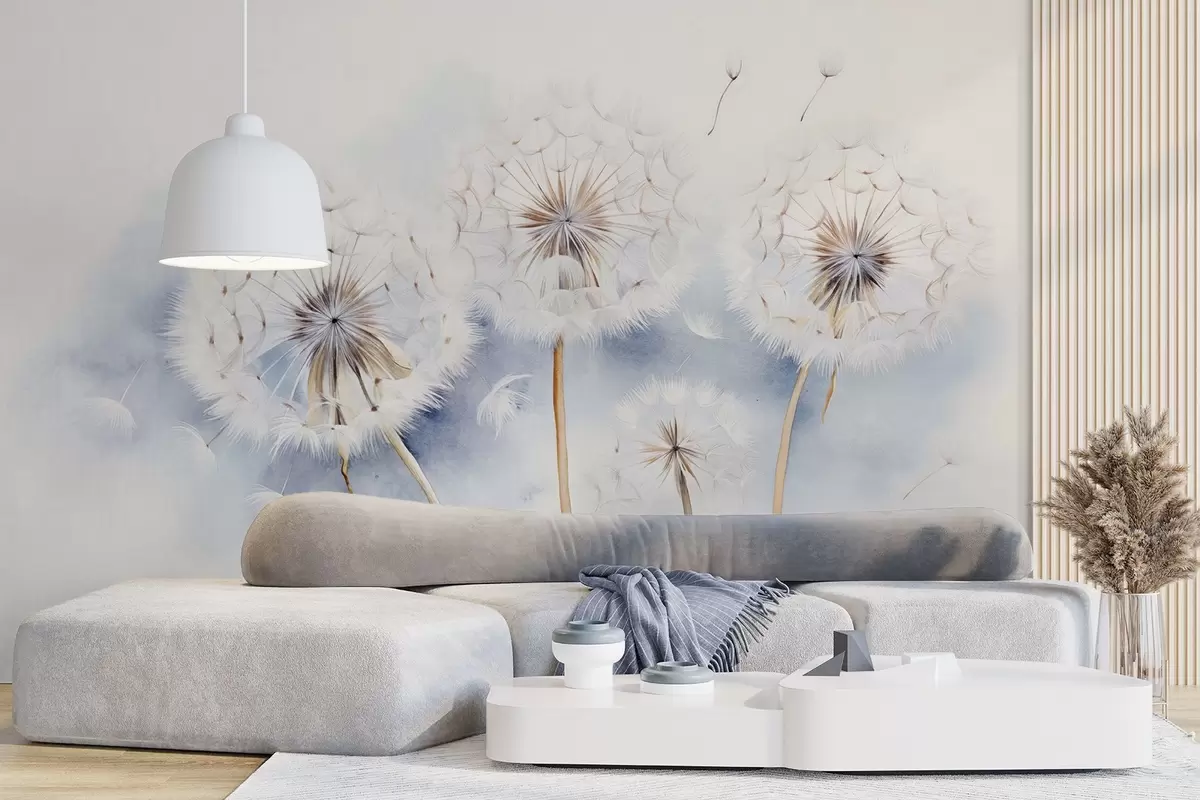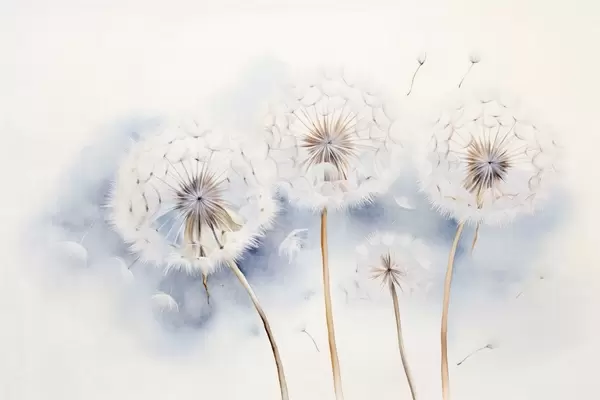 Fototapety Texturované pampelišky se semínky vznášejícími se ve vzduchu, světle modré a bílé pozadí, jemný styl kresby Č. w09190