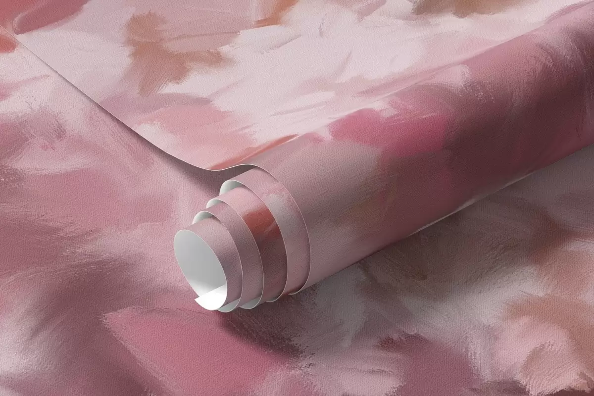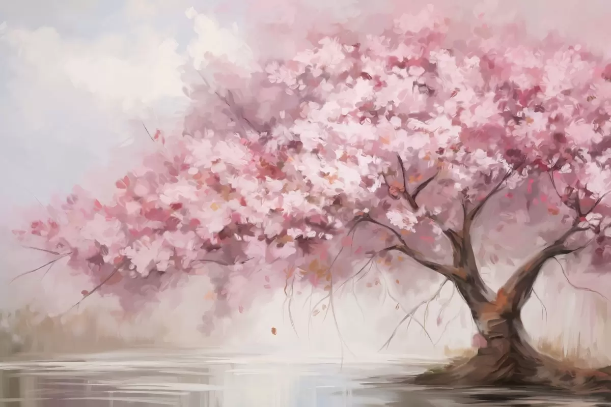 Fototapety Abstraktní růžový kvetoucí strom v plném květu, vedle řeky, jemné tahy štětcem a pastelové barvy Č. w09193
