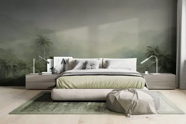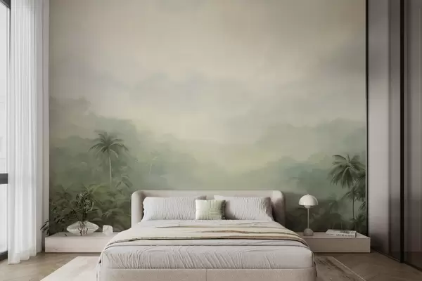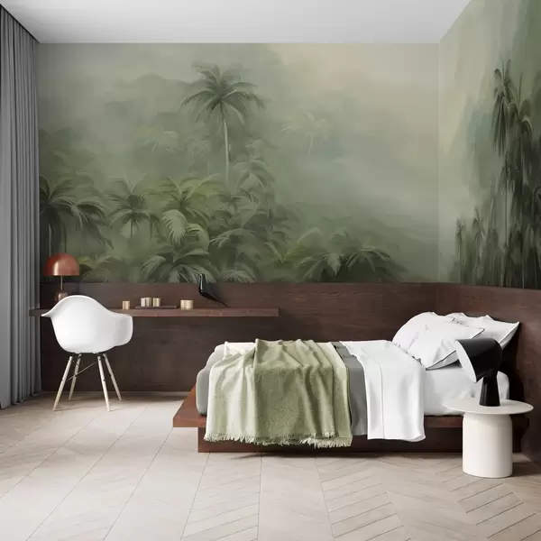 Fototapety Krajina Gungle se svěžími zelenými palmami a kopci , jemné pastelové barvy, texturovaná imitace malby Č. w09194
