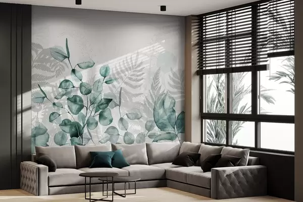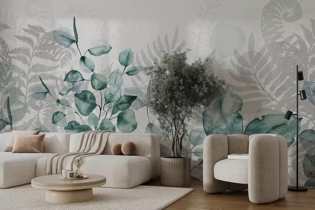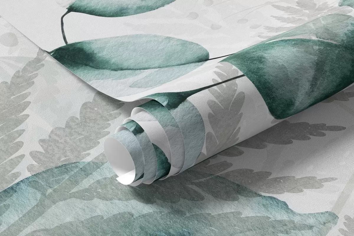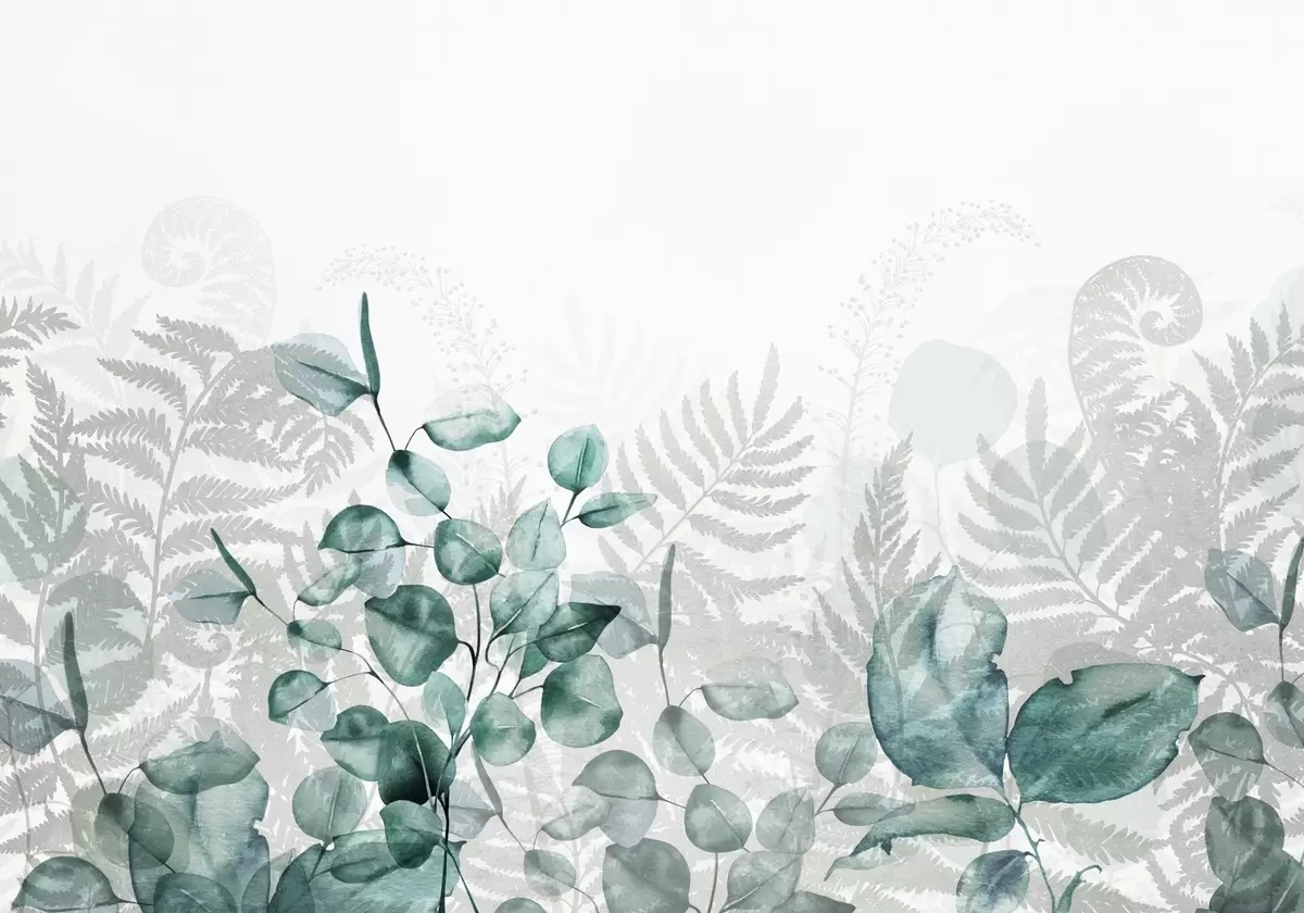 Fototapety Eukalyptus a listy kapradí v odstínech zelené a šedé, akvarelový efekt , botanická ilustrace Č. w09197