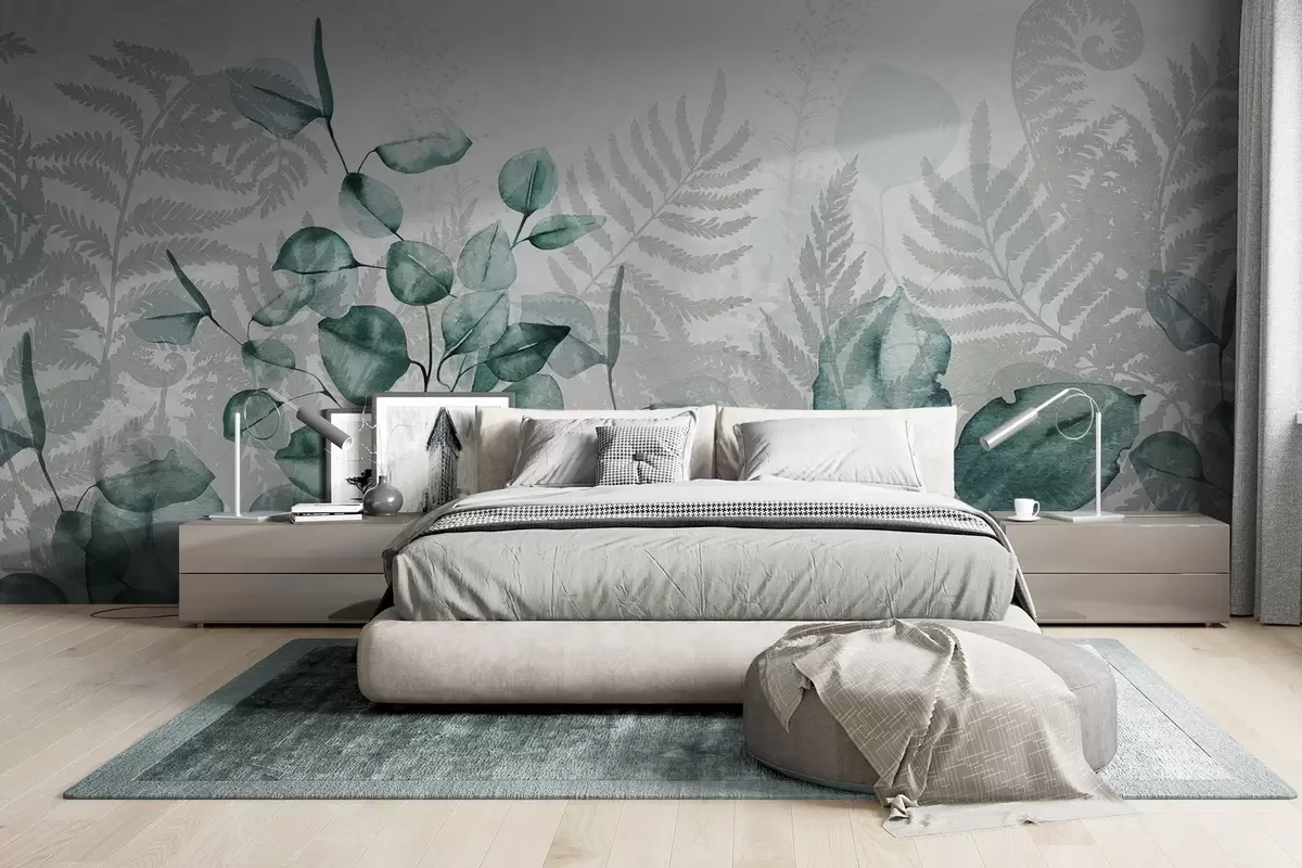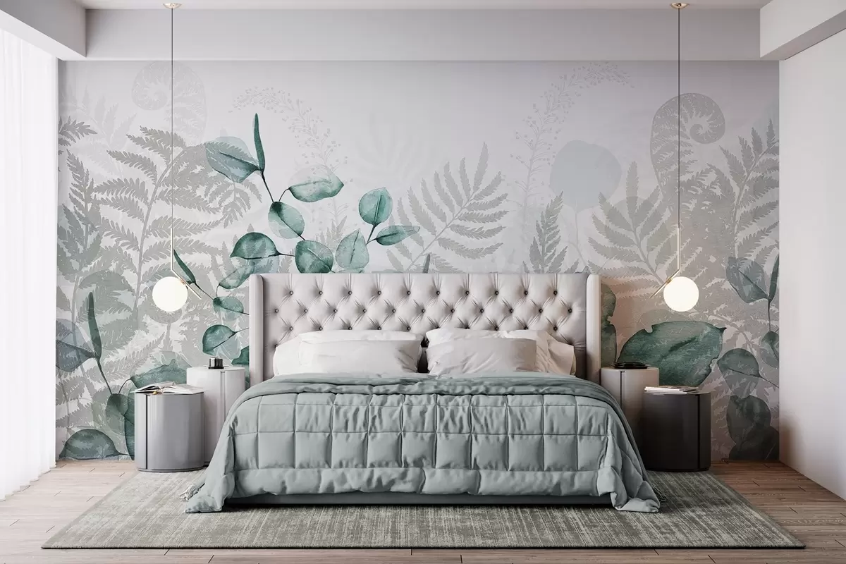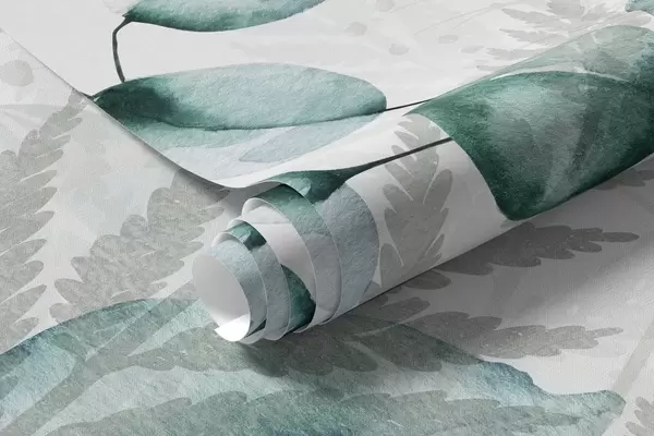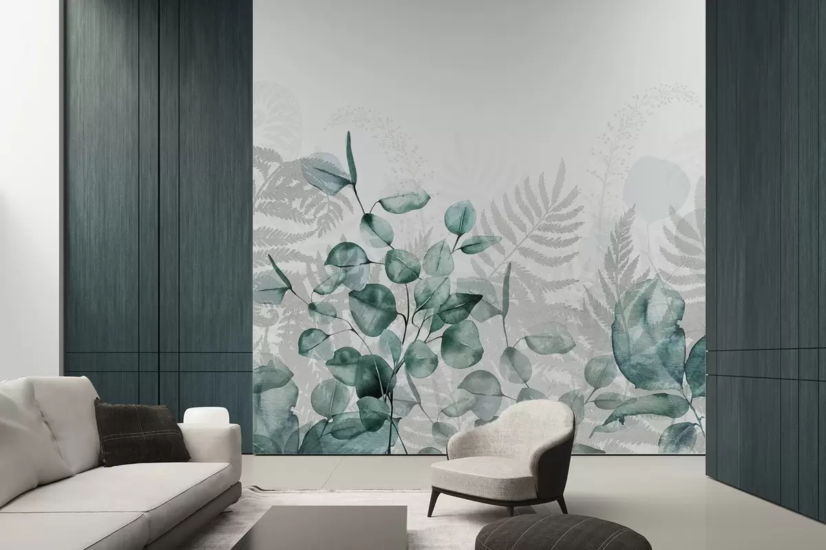 Fototapety Eukalyptus a listy kapradí v odstínech zelené a šedé, akvarelový efekt , botanická ilustrace Č. w09197