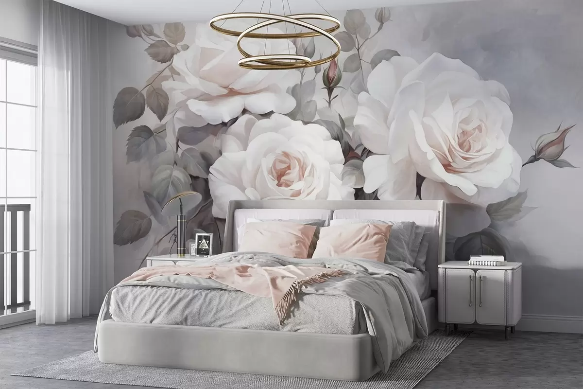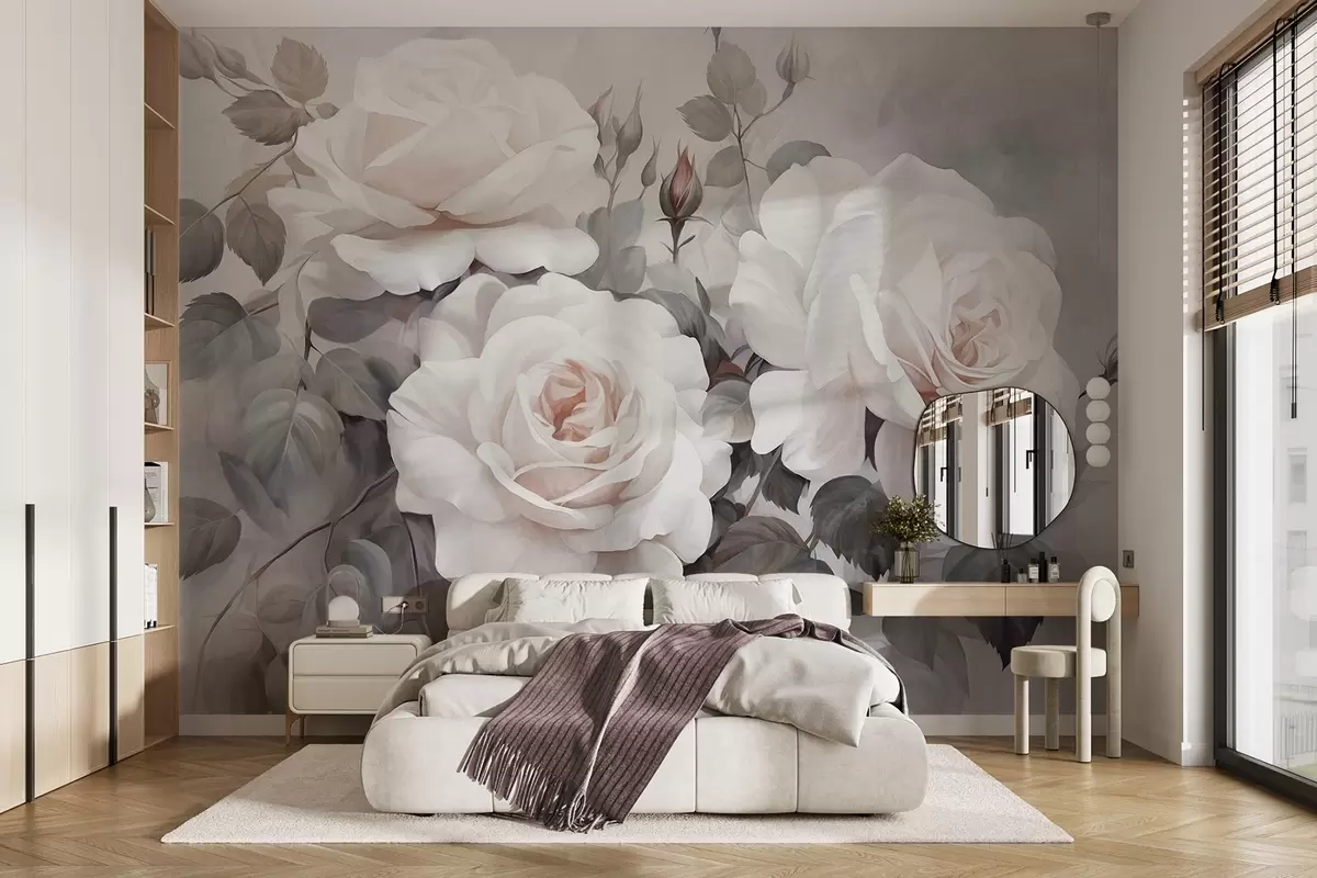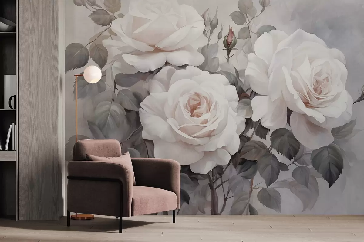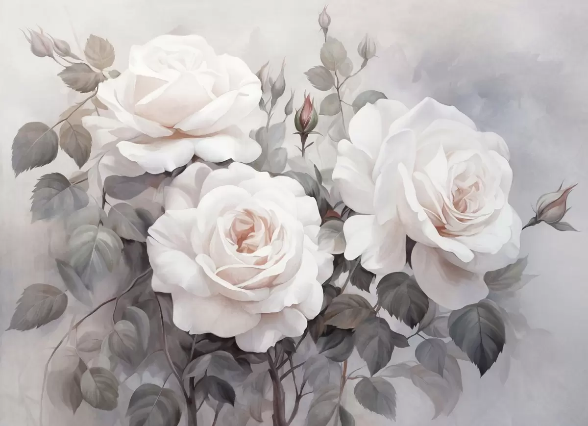 Fototapety Texturované bílé růže s listy a stonky, jemné tlumené pastelové barvy, elegantní vintage styl , jemné tahy štětcem Č. w09198