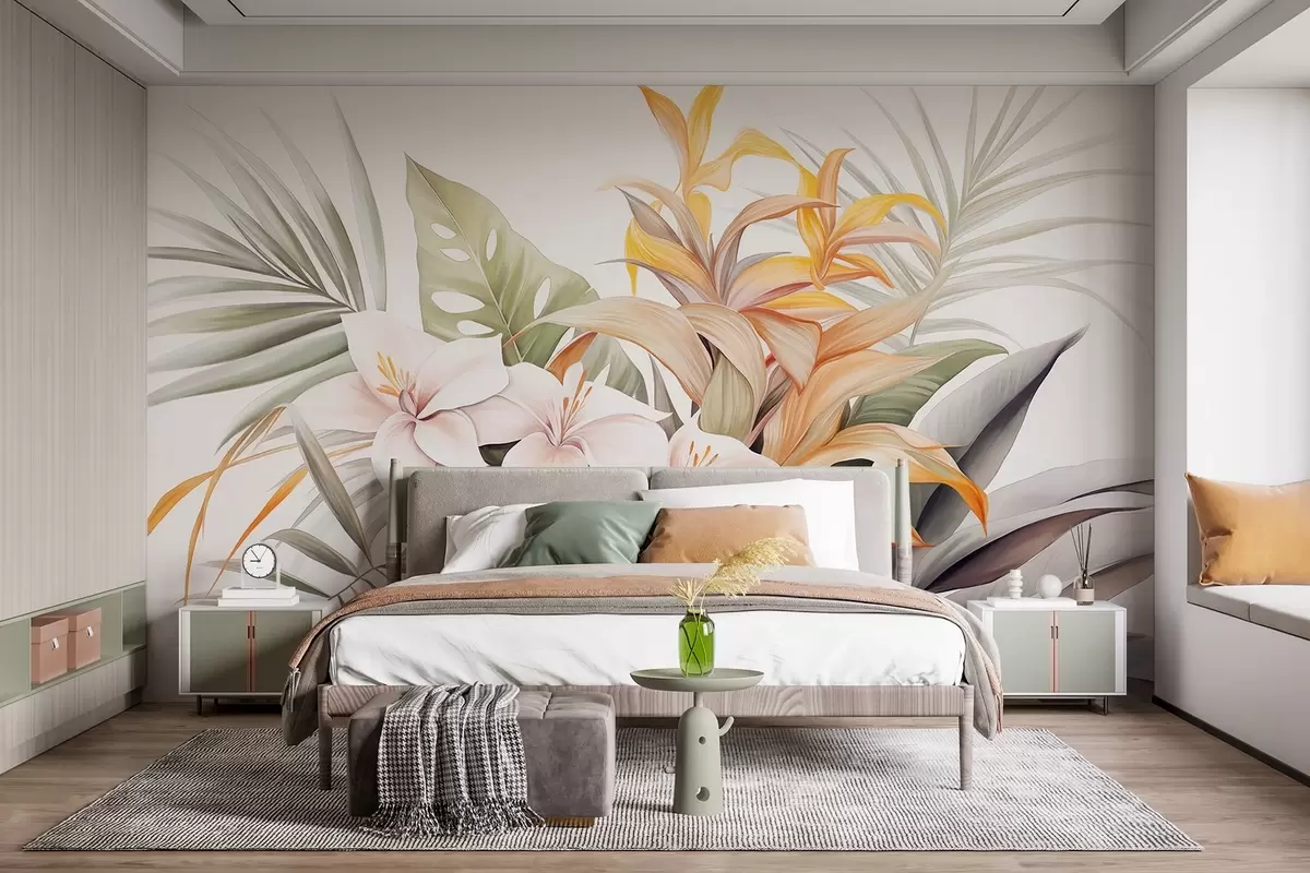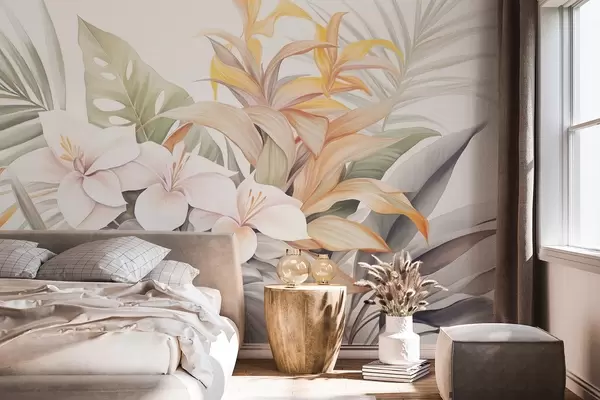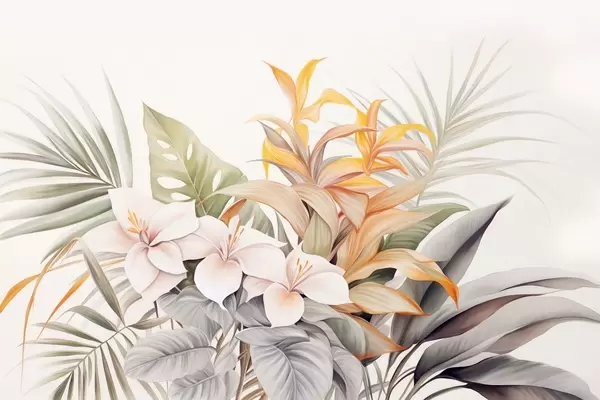 Fototapety Botanická ilustrace tropických květin s listy palmy a monstery, jemné barvy, akvarelový styl Č. w09201