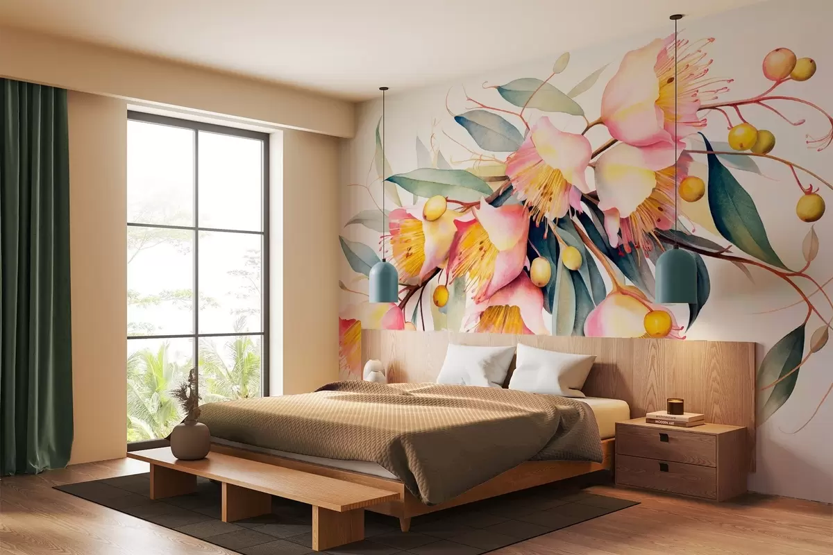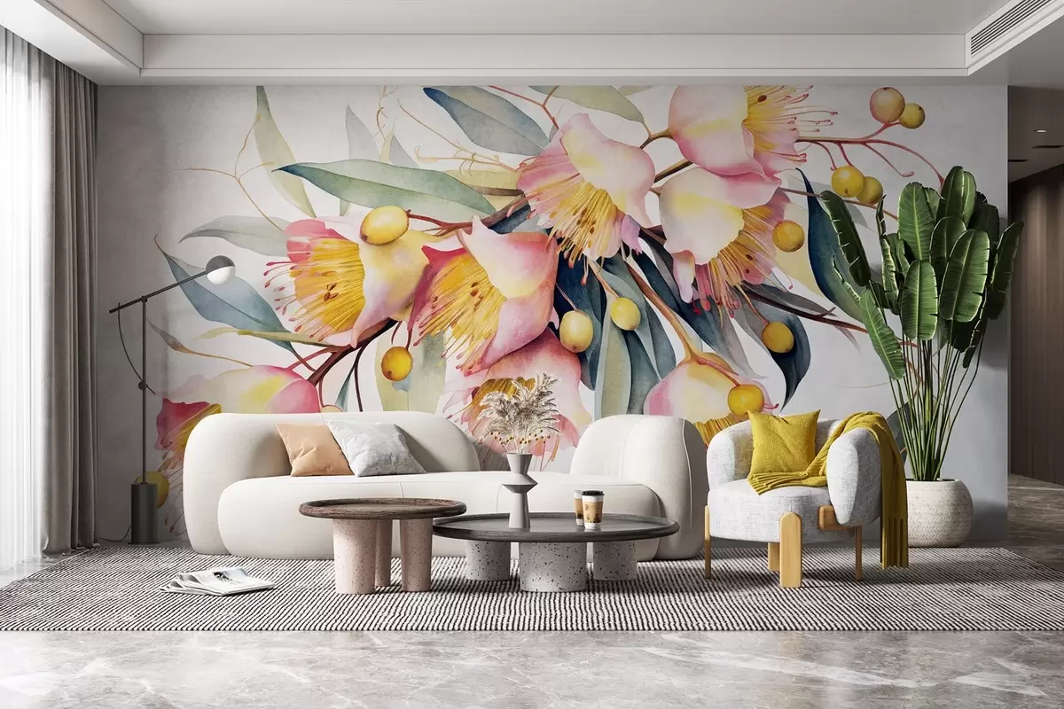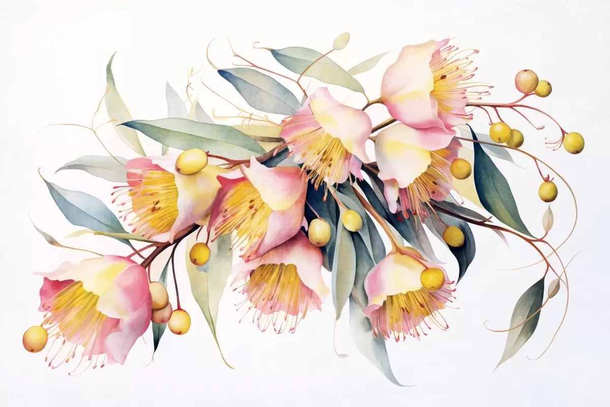 Fototapety Květy eukalyptu se zelenými listy, akvarelový styl, měkké a texturované, světlé pozadí, botanický květinový design Č. w09202