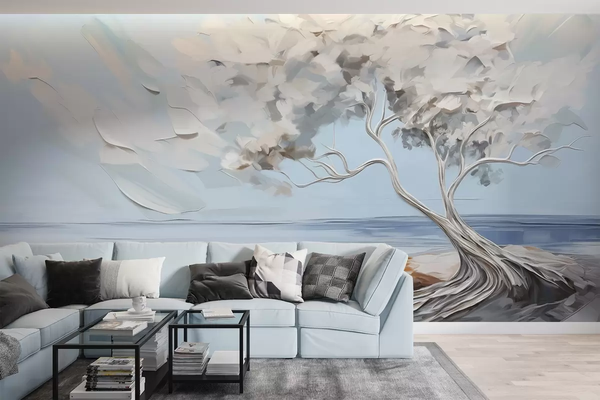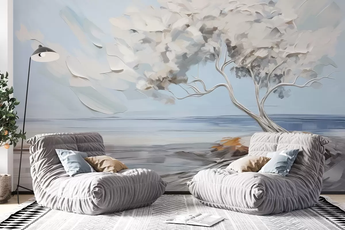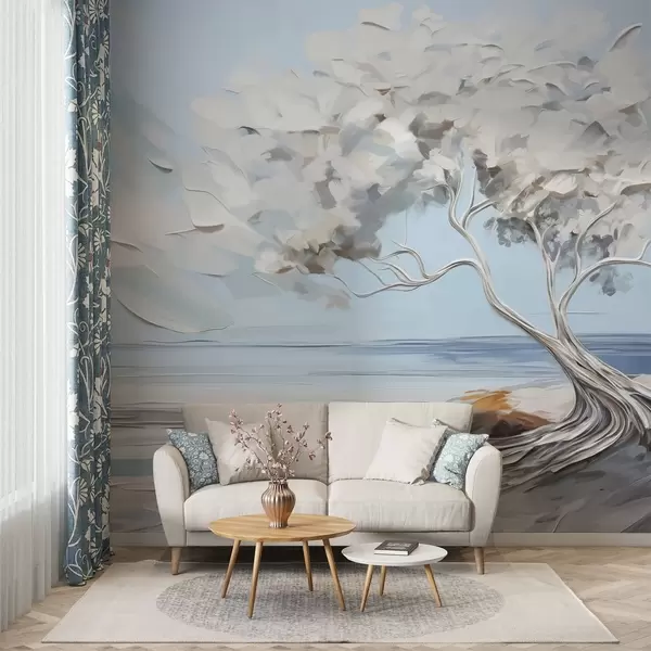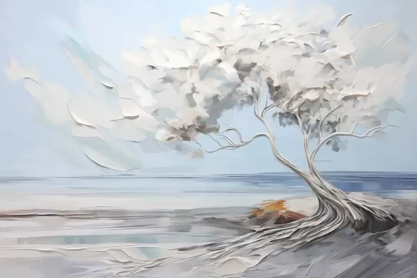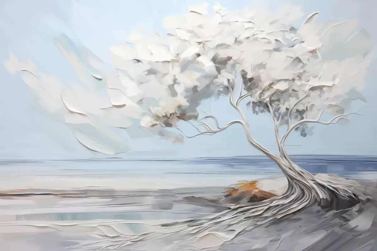 Fototapety Bílý strom s hustými a strukturovanými listy na písečné pláži, krajina se světle modrou oblohou Č. w09205