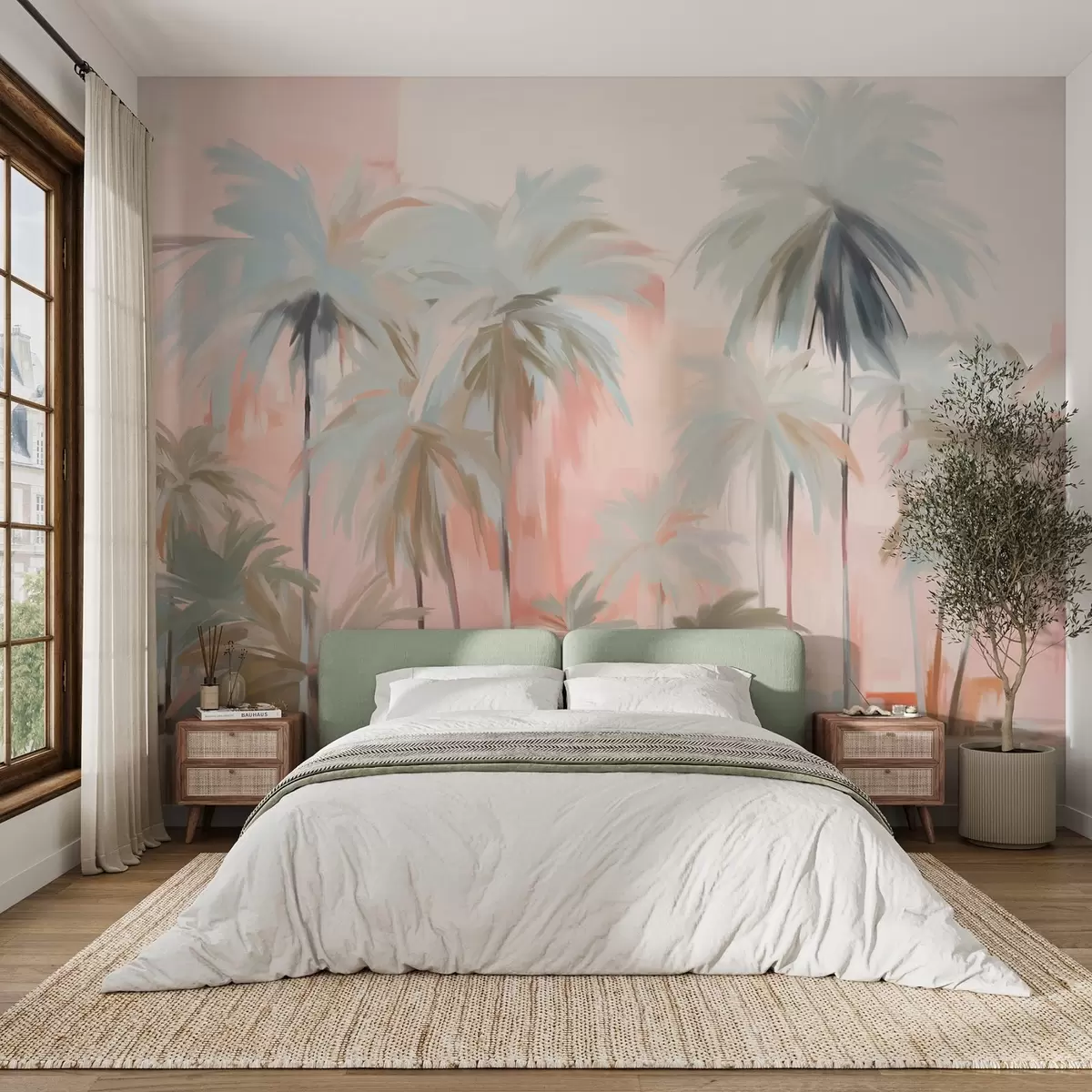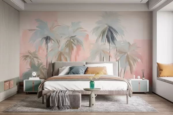 Fototapety Abstraktní minimalistické pastelové tropické palmy na pozadí jemných růžových a broskvových odstínů Č. w09212