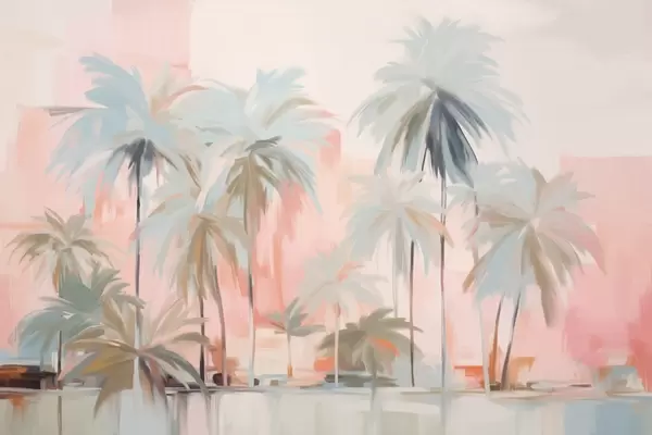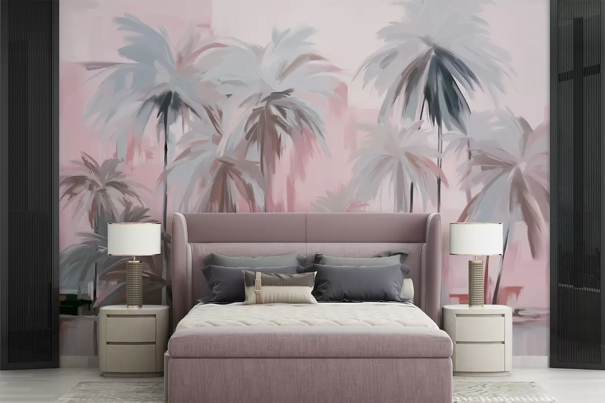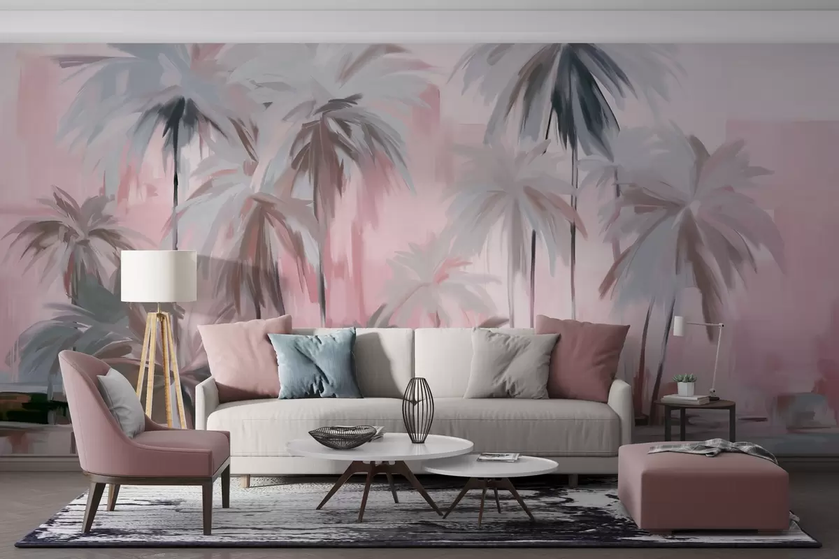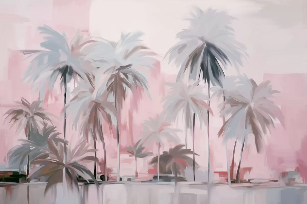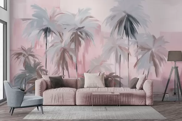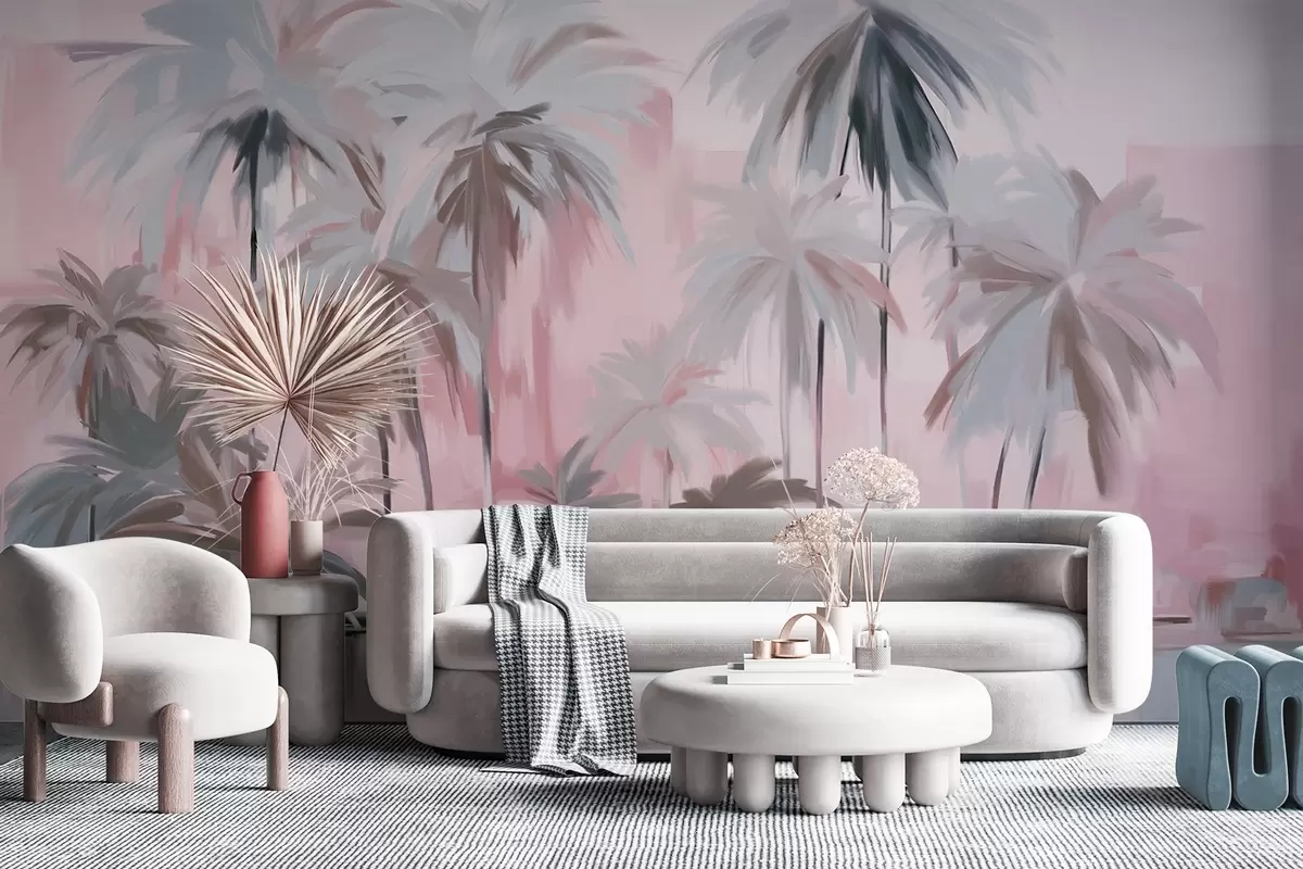 Fototapety Abstraktní minimalistické pastelové tropické palmy na pozadí tlumených růžových a šedých odstínů Č. w09212v1