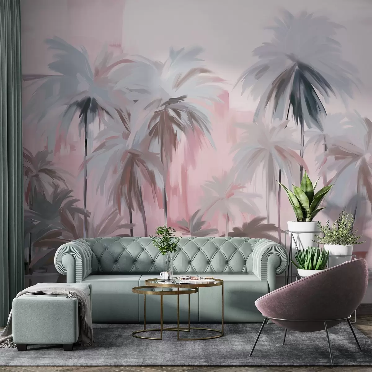 Fototapety Abstraktní minimalistické pastelové tropické palmy na pozadí tlumených růžových a šedých odstínů Č. w09212v1
