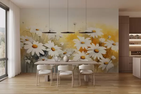 Fototapety Pole bílých sedmikrásek se žlutými středy na jemném žlutém a béžovém pozadí, akvarelový styl Č. w09218