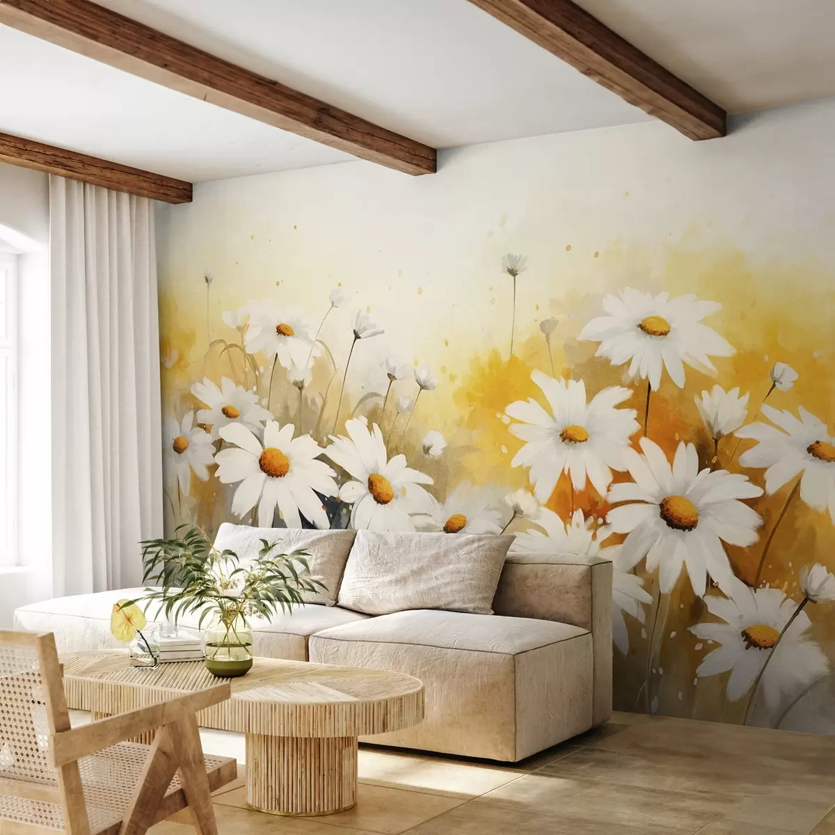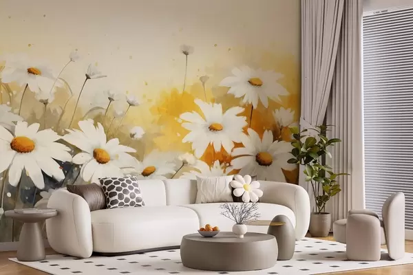 Fototapety Pole bílých sedmikrásek se žlutými středy na jemném žlutém a béžovém pozadí, akvarelový styl Č. w09218