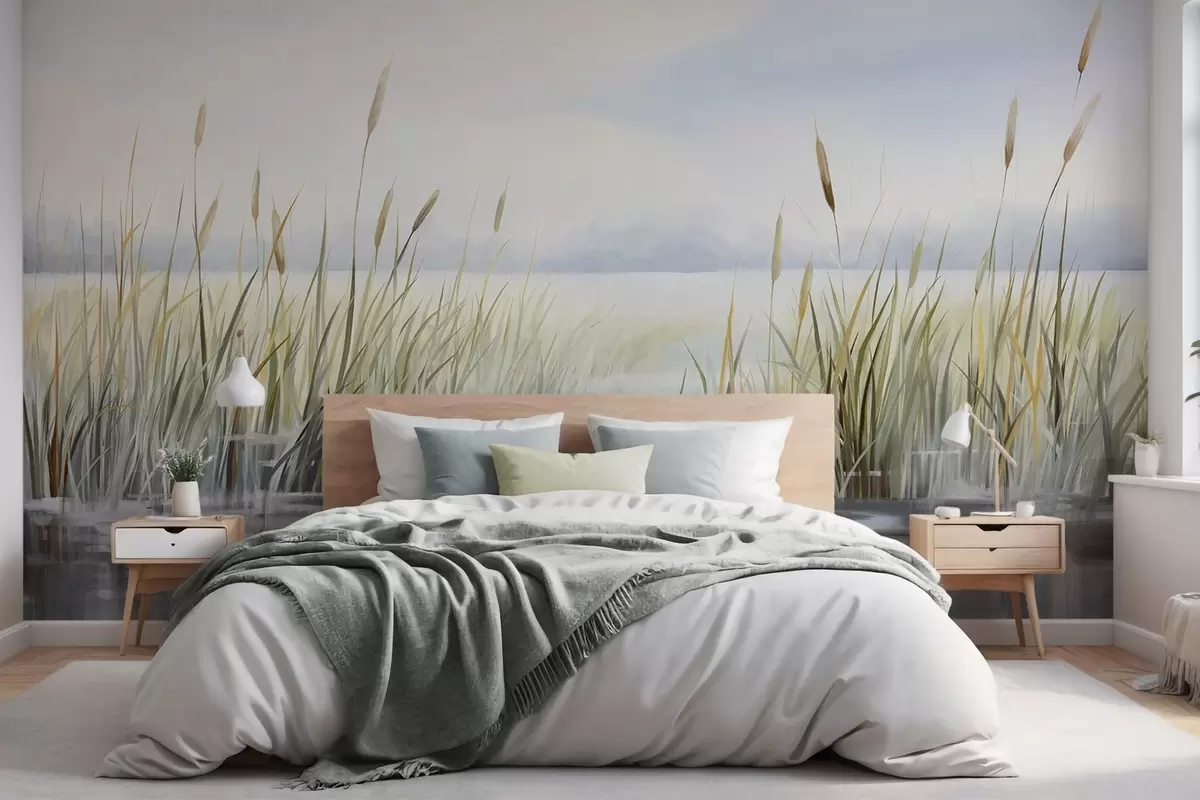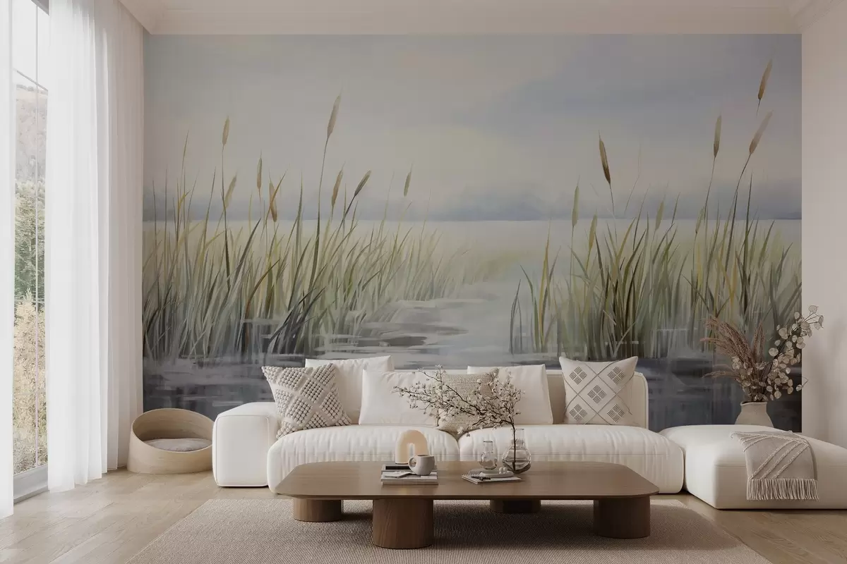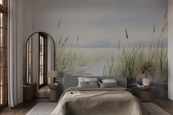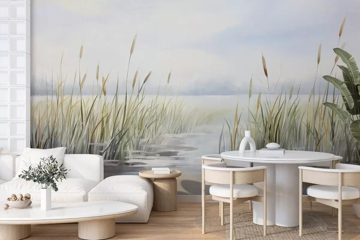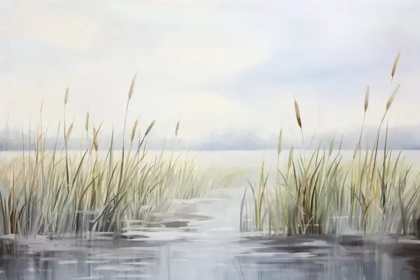 Fototapety Akvarelová malba s texturou imitující krajinu s jezerem, trávou, zataženou oblohou a rozmazaným pozadím Č. w09219