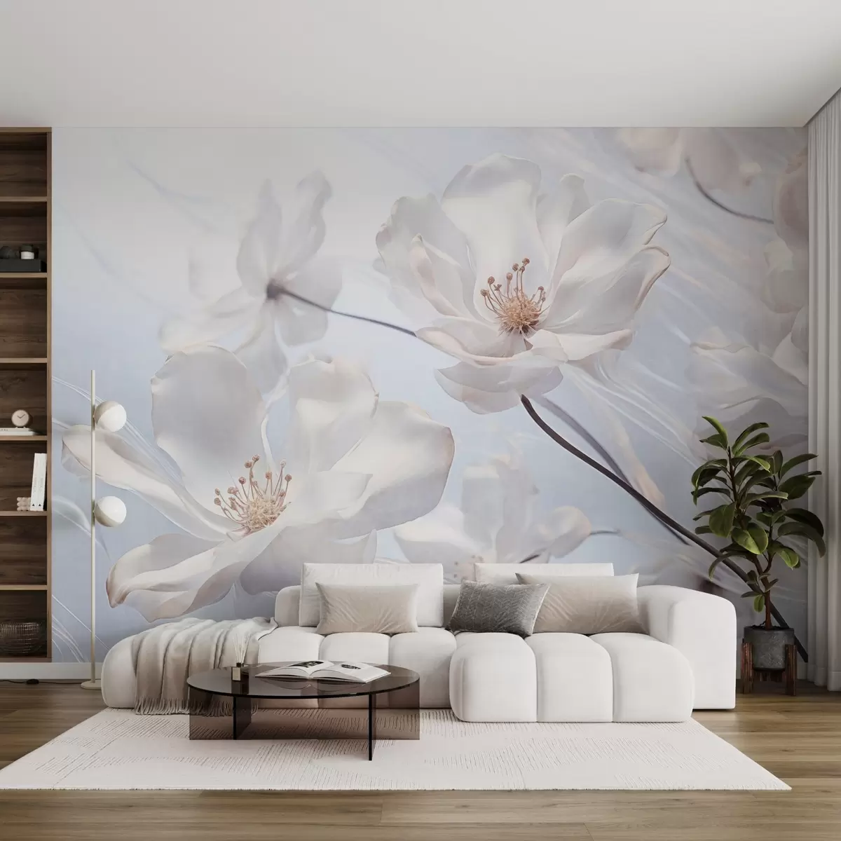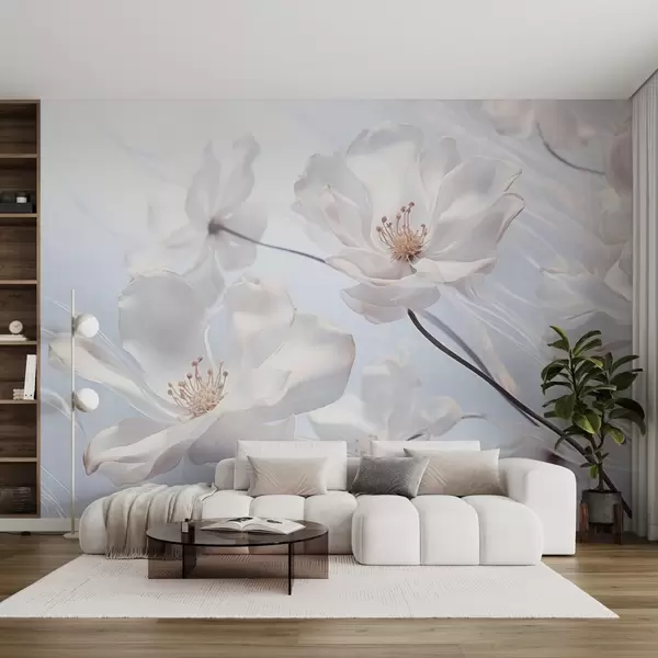 Fototapety Bílé průhledné květy s jemnými okvětními lístky, jemné světle modré pozadí, elegantní, romantické, zasněné Č. w09233