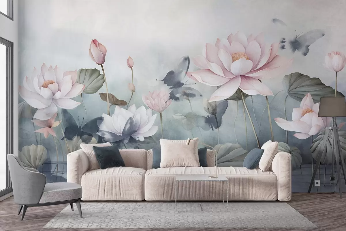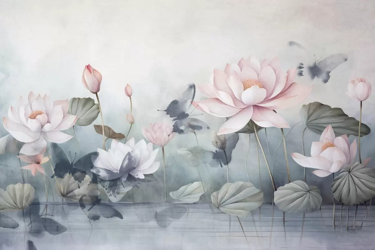 Fototapety Lotosové květy s texturou, růžové pastelové okvětní lístky, zelené listy, odraz vody, jemné pastelové barvy , akvarelový efekt Č. w09254