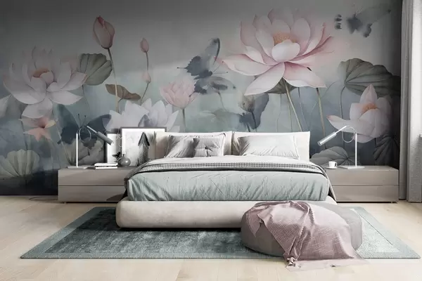 Fototapety Lotosové květy s texturou, růžové pastelové okvětní lístky, zelené listy, odraz vody, jemné pastelové barvy , akvarelový efekt Č. w09254