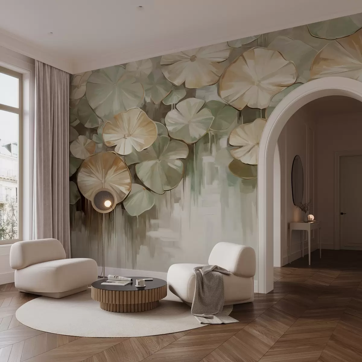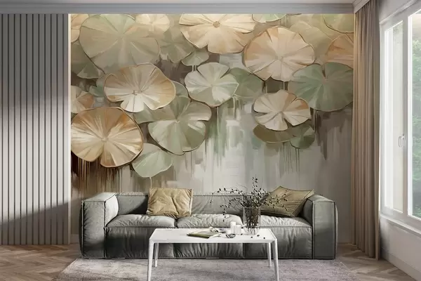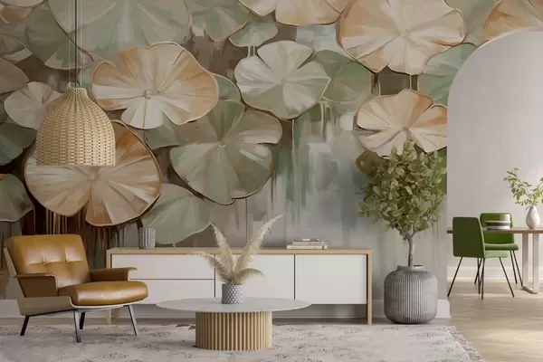 Fototapety Texturované lekníny v zelených a béžových barvách v rybníce, pozadí je rozmazaná směs bílé, zelené a hnědé Č. w09255