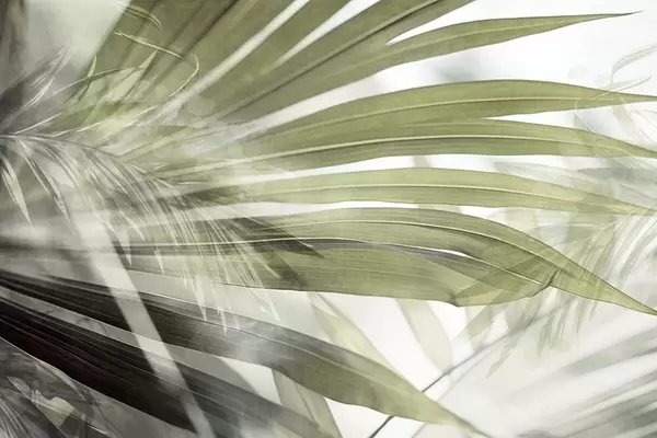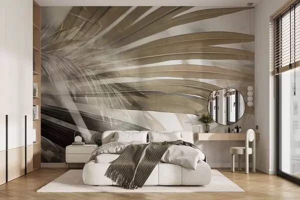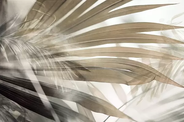 Fototapety Palmové listy se světle hnědým odstínem, které se překrývají a vytvářejí vrstvený efekt, na jemném, neutrálním pozadí Č. w09256