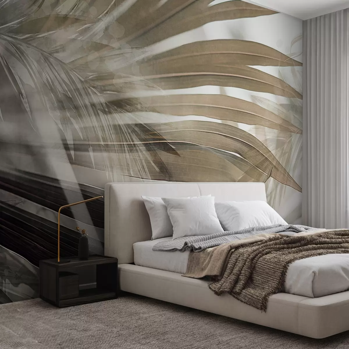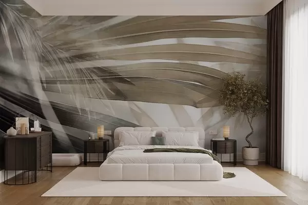 Fototapety Palmové listy se světle hnědým odstínem, které se překrývají a vytvářejí vrstvený efekt, na jemném, neutrálním pozadí Č. w09256