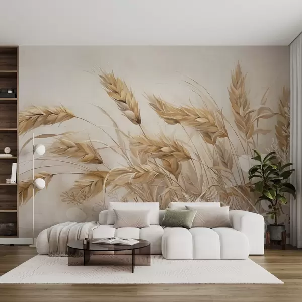 Fototapety Pšeničné pole s béžovými klasy kývajícími se ve větru, jemné a tlumené barvy, které vytvářejí pocit tepla Č. w09264