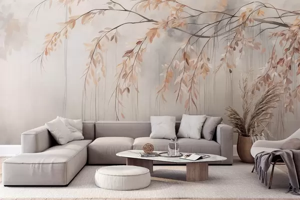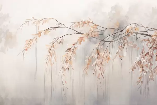 Fototapety Větev se světle oranžovými listy visícími dolů, světle šedé texturované rozmazané pozadí, měkký a jemný styl Č. w09265