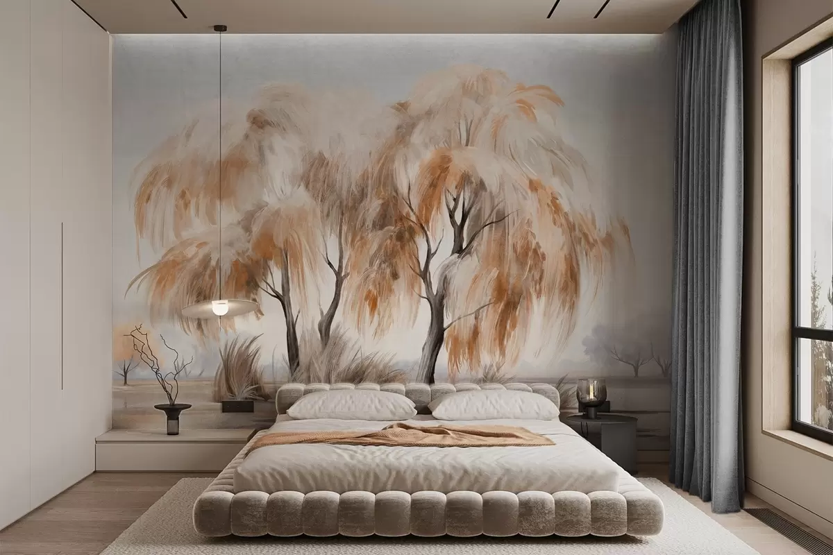 Fototapety Texturované vrby s hnědými a bílými listy na břehu jezera, kolem nich tráva, mlhavý den Č. w09268