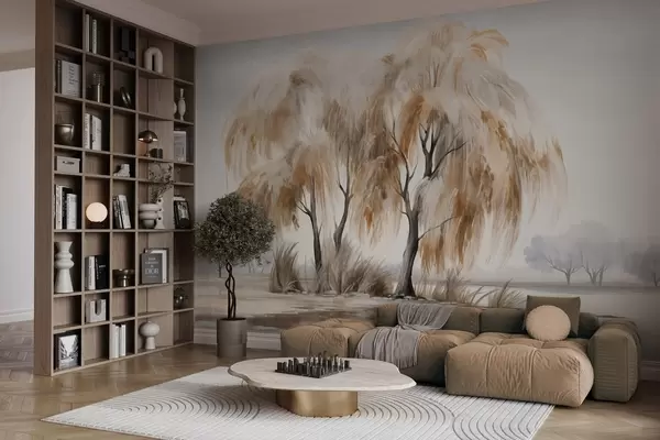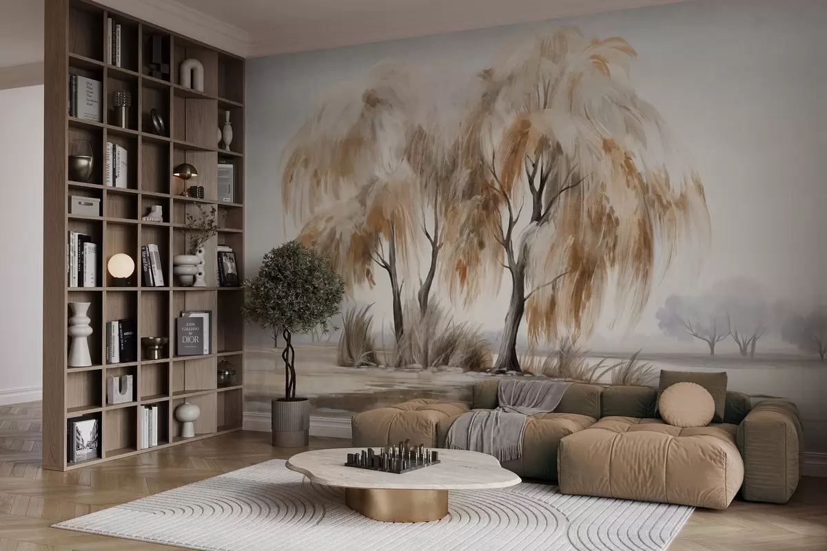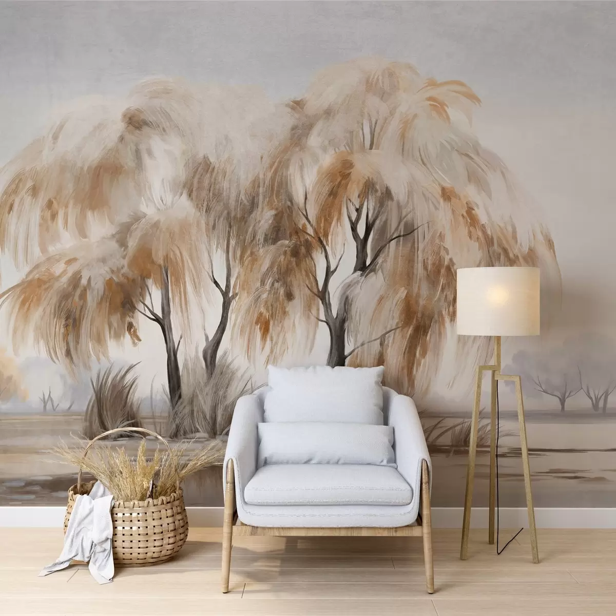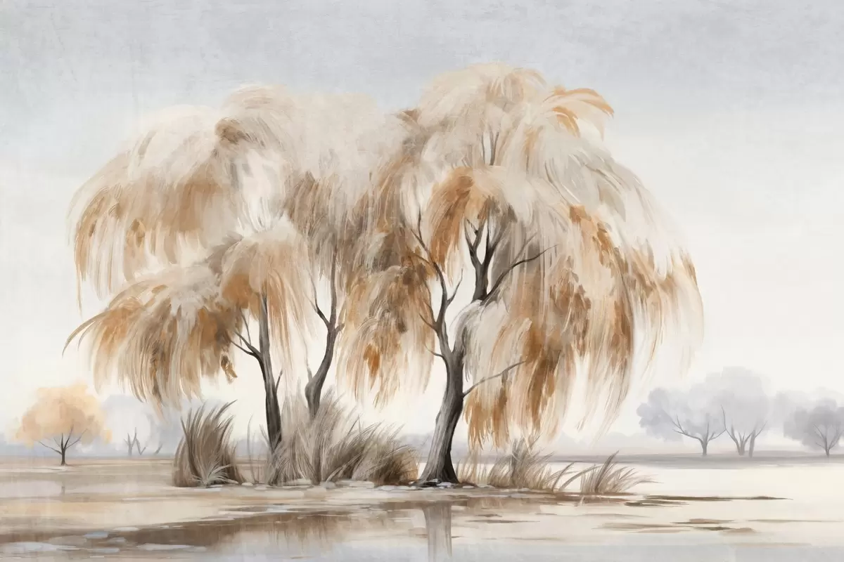 Fototapety Texturované vrby s hnědými a bílými listy na břehu jezera, kolem nich tráva, mlhavý den Č. w09268