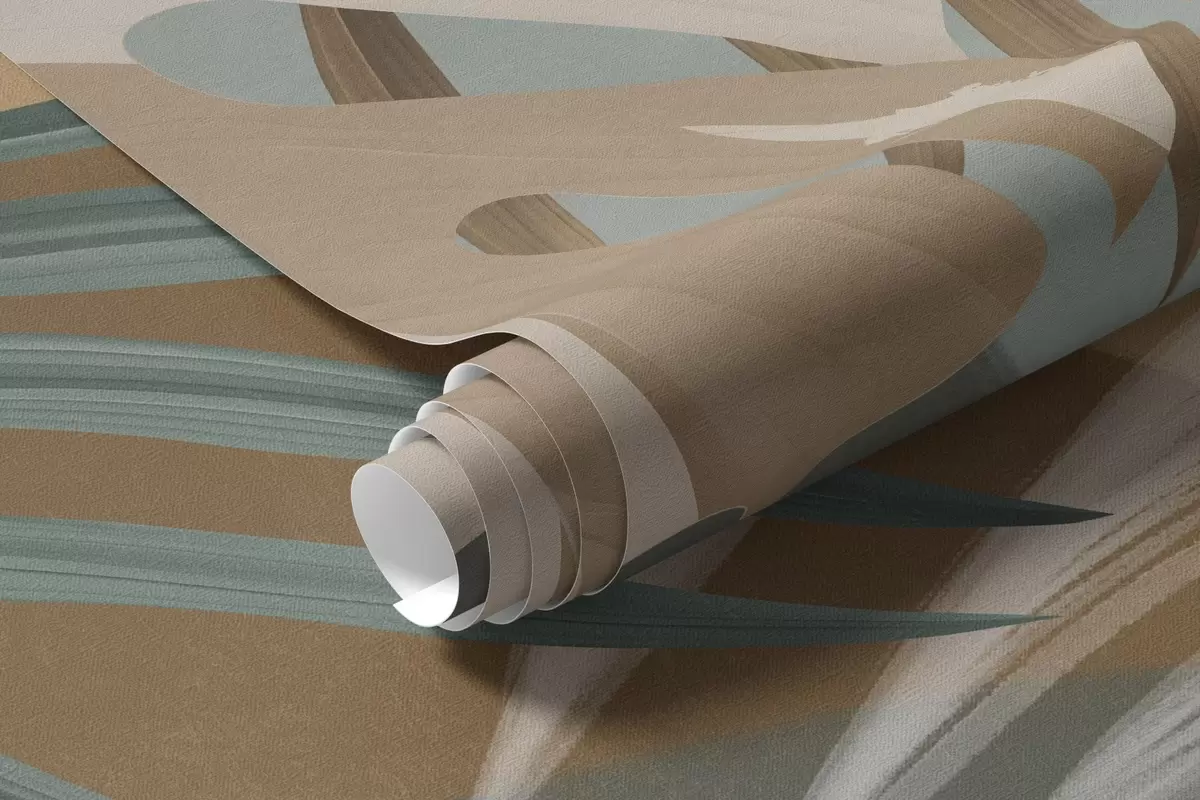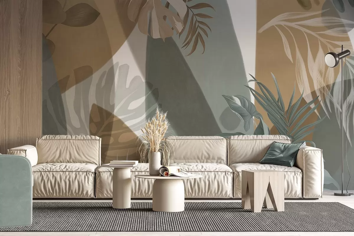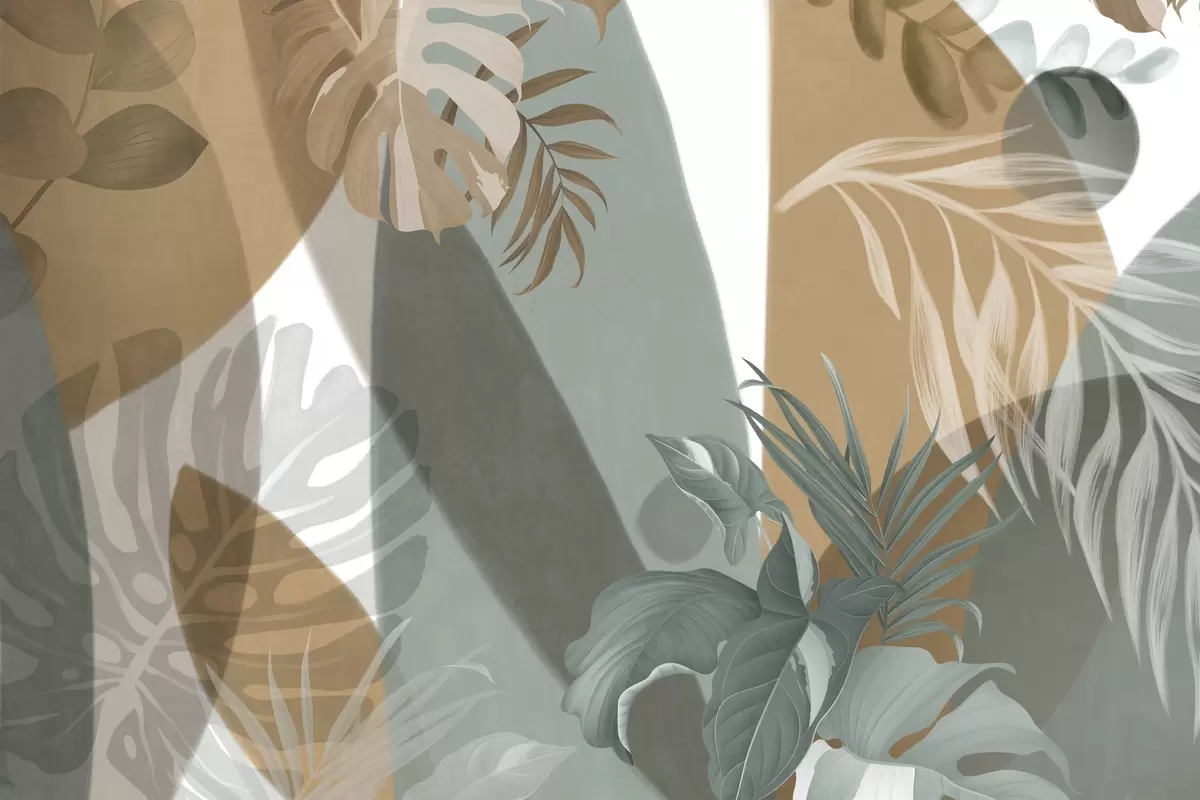 Fototapety Listy monstery a palmové listy ve vzoru hnědé, bílé a zelené barvy, tropická atmosféra, abstraktní tvary, dekorace Č. w09288