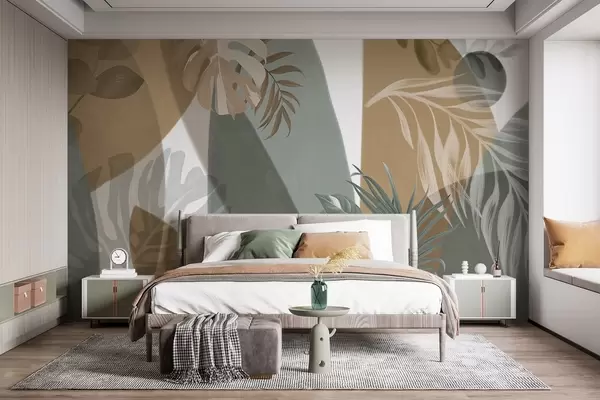Fototapety Listy monstery a palmové listy ve vzoru hnědé, bílé a zelené barvy, tropická atmosféra, abstraktní tvary, dekorace Č. w09288