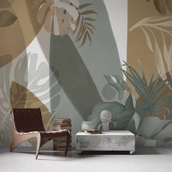 Fototapety Listy monstery a palmové listy ve vzoru hnědé, bílé a zelené barvy, tropická atmosféra, abstraktní tvary, dekorace Č. w09288