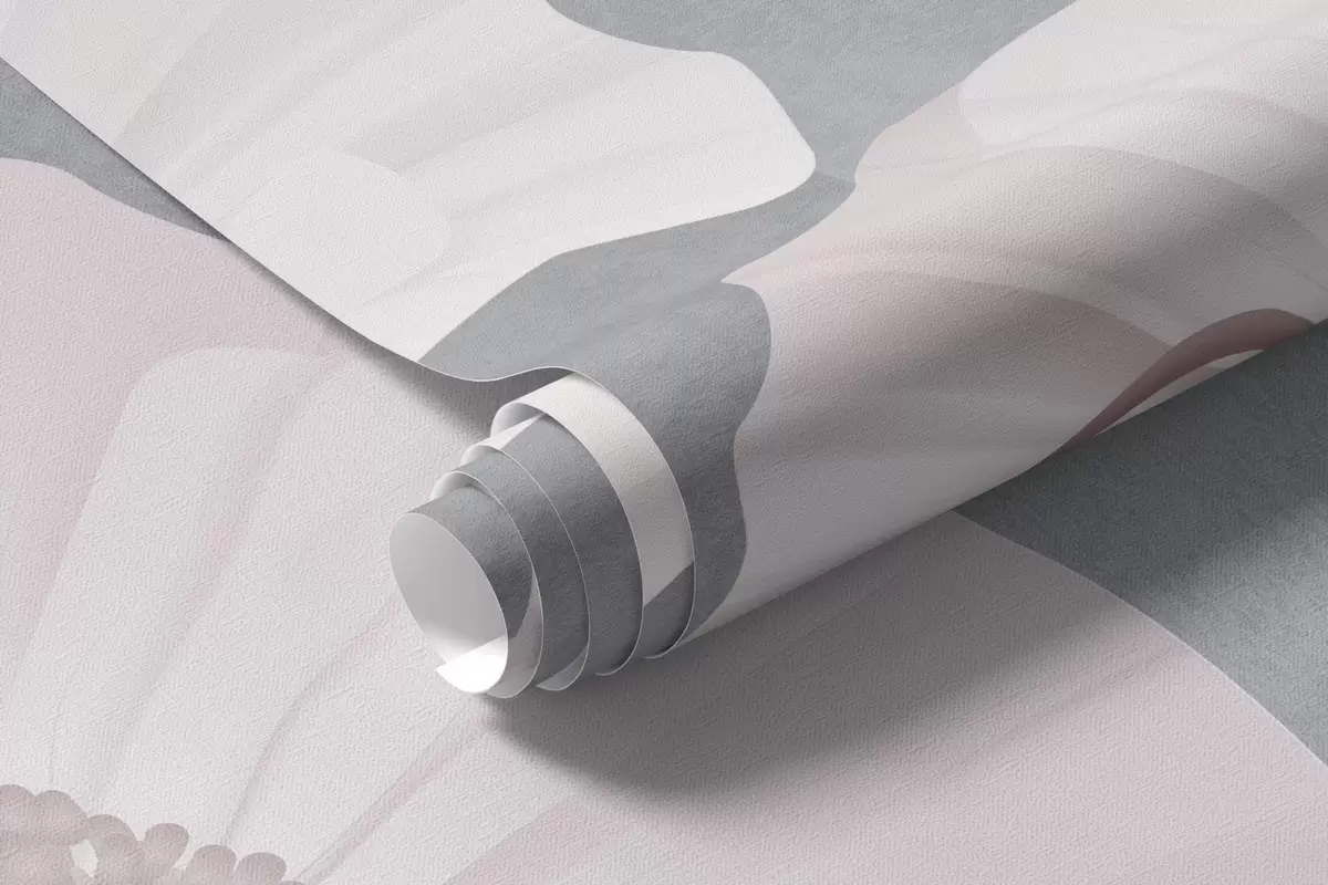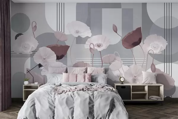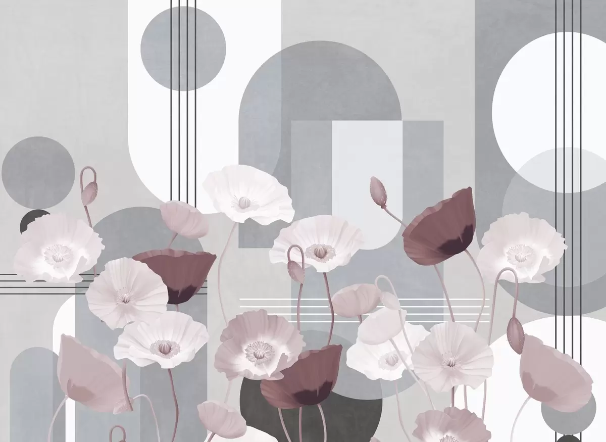 Fototapety Mák v bílé a šedé barvě s geometrickými tvary v pozadí, kruhy a oblouky, minimalistický styl, jemné barvy Č. w09289v1