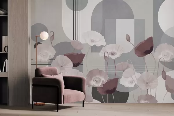Fototapety Mák v bílé a šedé barvě s geometrickými tvary v pozadí, kruhy a oblouky, minimalistický styl, jemné barvy Č. w09289v1