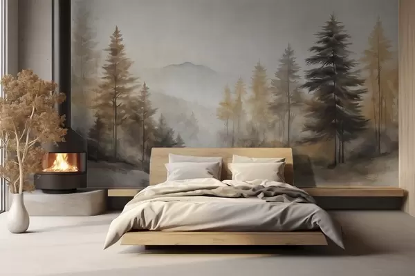 Fototapety Texturovaný podzimní les s vysokými borovicemi a horami v pozadí, barvy jsou tlumené a zemité malířský styl Č. w09290