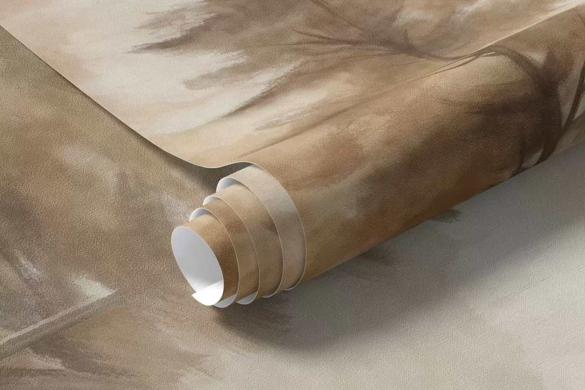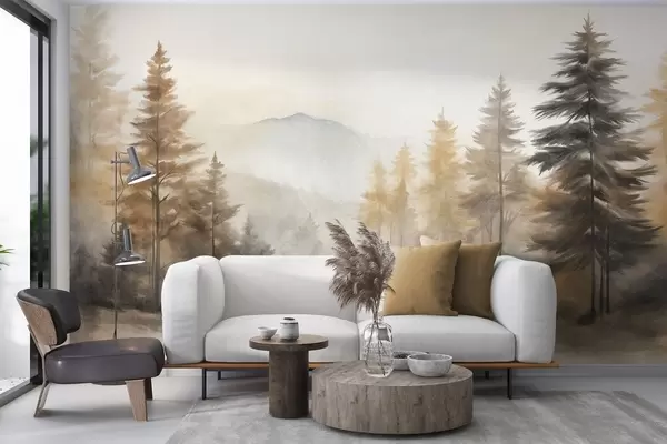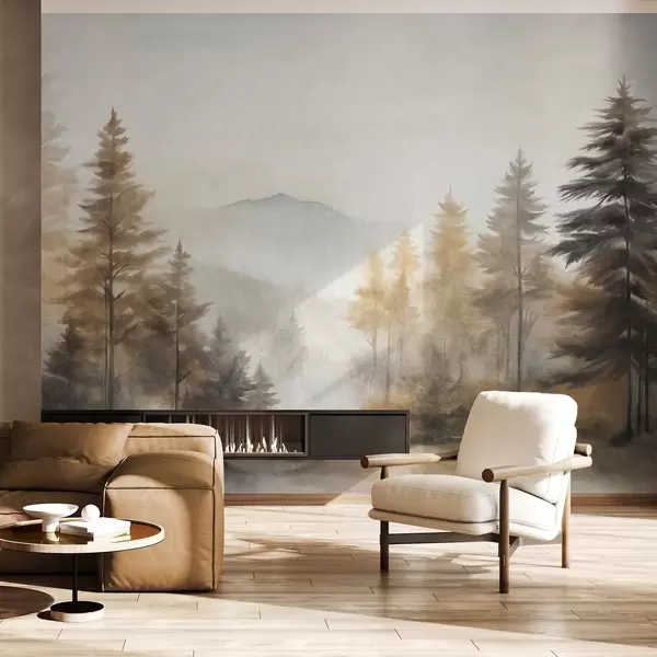 Fototapety Texturovaný podzimní les s vysokými borovicemi a horami v pozadí, barvy jsou tlumené a zemité malířský styl Č. w09290
