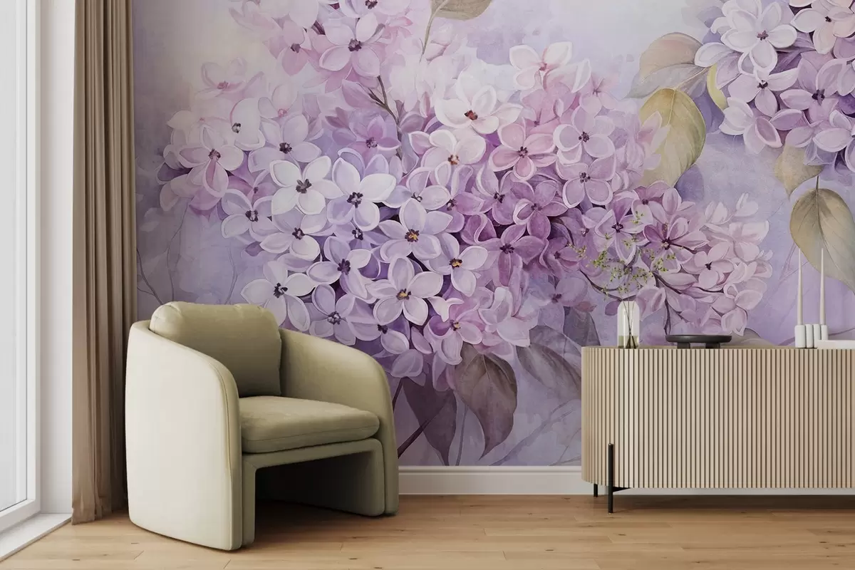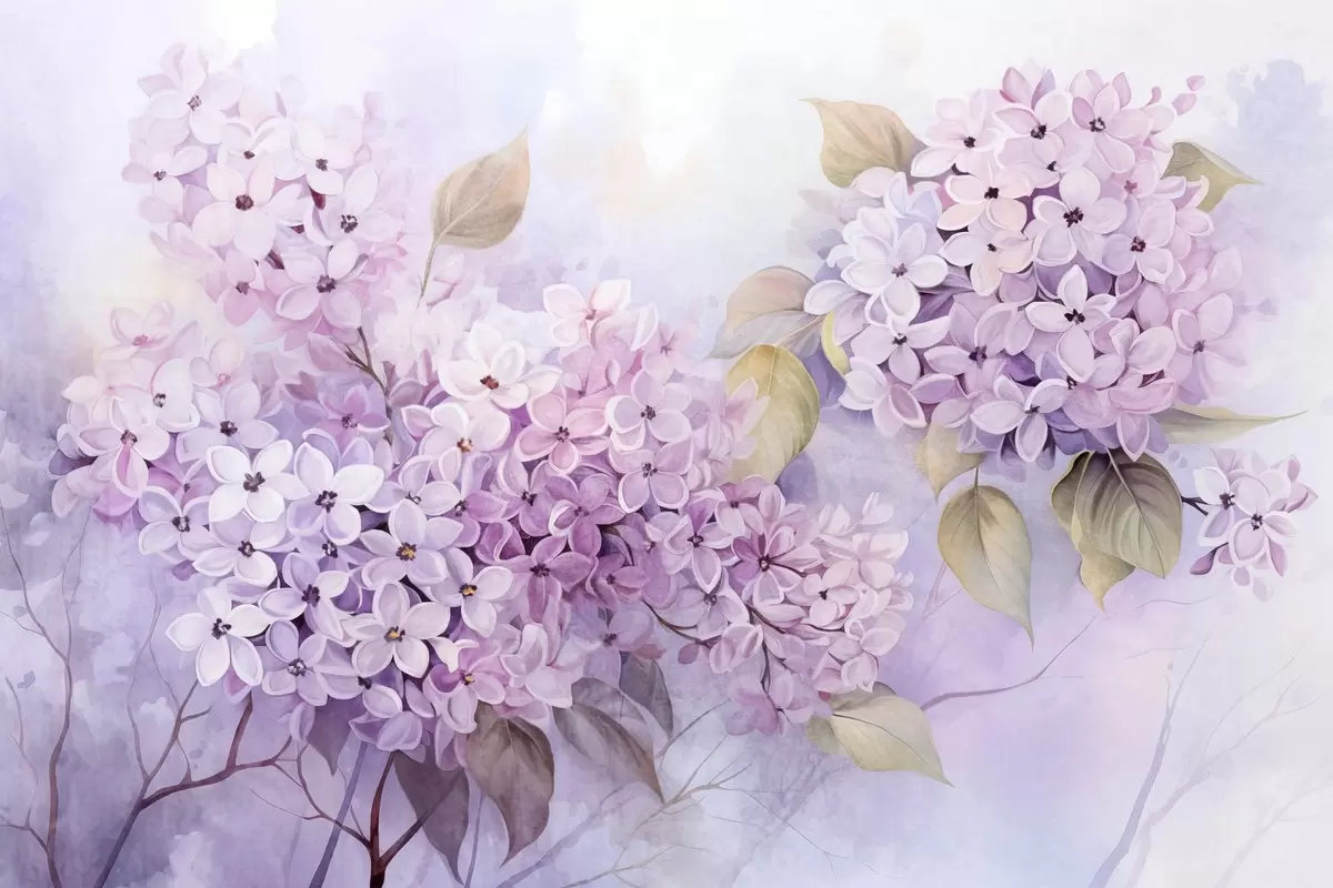 Fototapety Šeříkové květy se světle fialovými okvětními lístky, světle zelené listy, akvarelový styl, měkké, pastelové barvy, jemné tahy štětcem Č. w09291