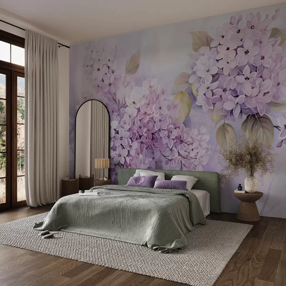 Fototapety Šeříkové květy se světle fialovými okvětními lístky, světle zelené listy, akvarelový styl, měkké, pastelové barvy, jemné tahy štětcem Č. w09291