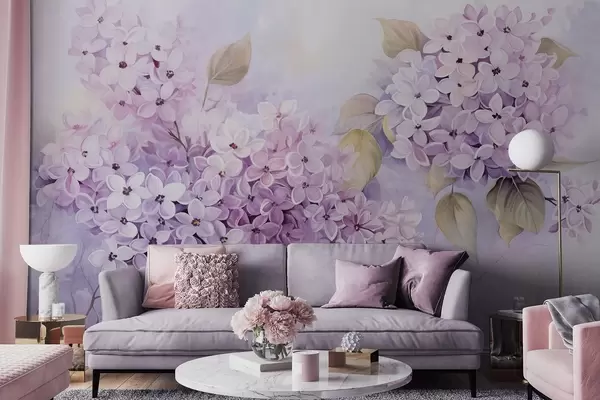 Fototapety Šeříkové květy se světle fialovými okvětními lístky, světle zelené listy, akvarelový styl, měkké, pastelové barvy, jemné tahy štětcem Č. w09291
