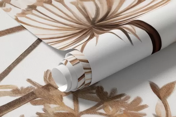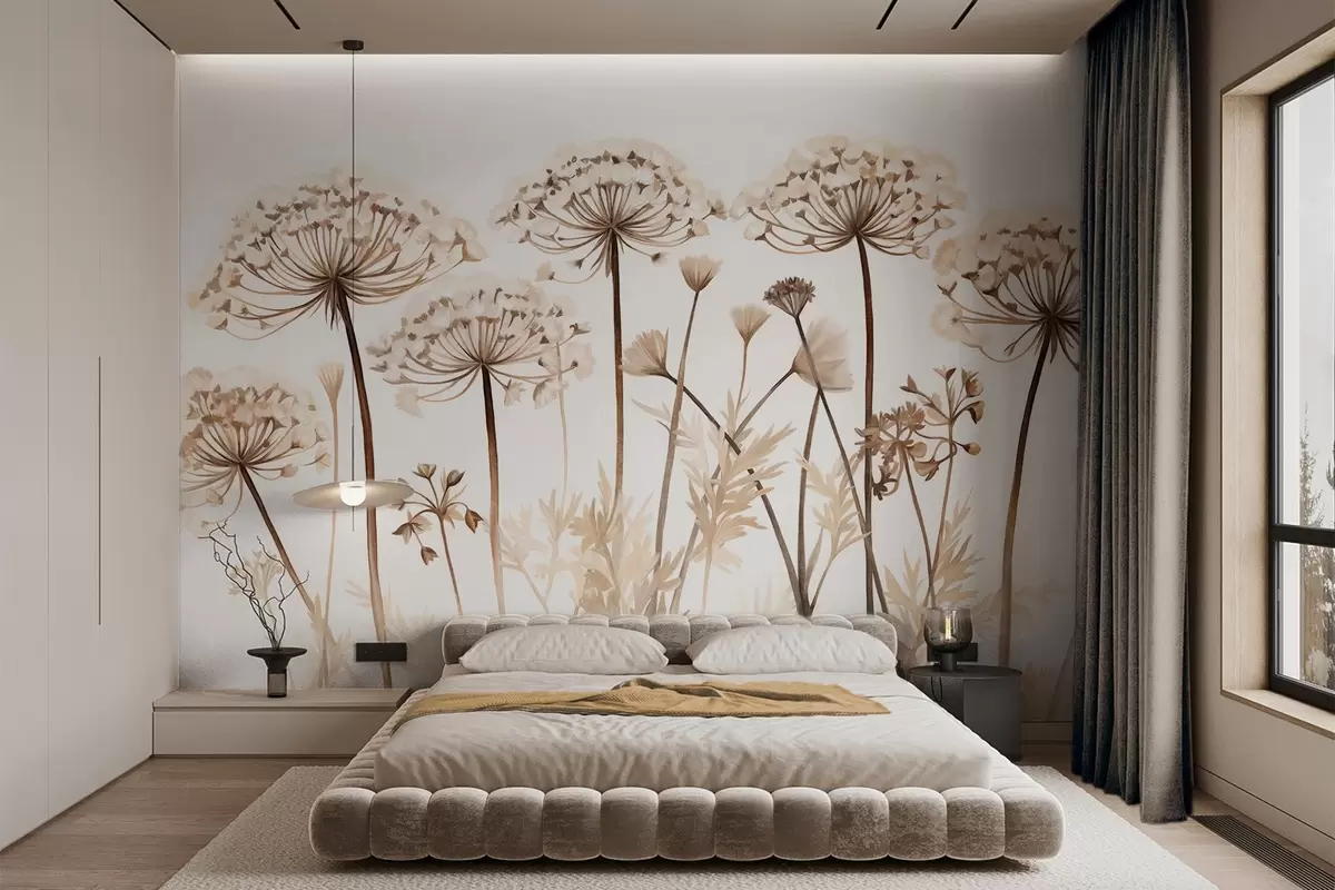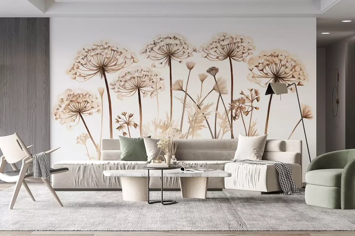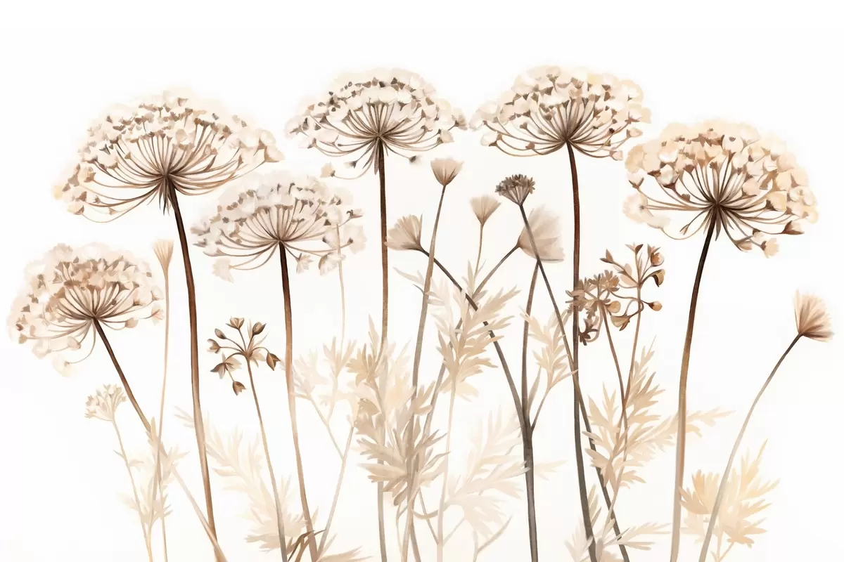 Fototapety Květy krajky královny Anny v poli, texturovaná imitace malby, hnědá, béžová a bílá paleta barev, botanická ilustrace Č. w09294