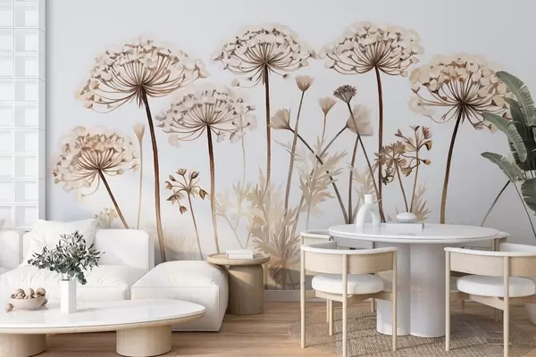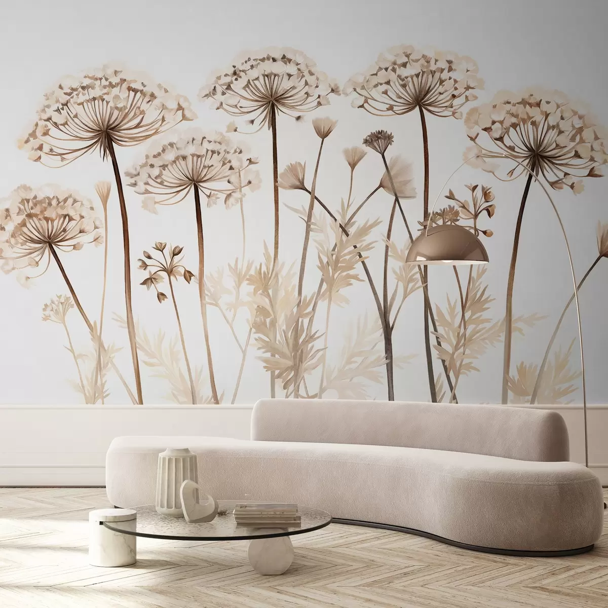 Fototapety Květy krajky královny Anny v poli, texturovaná imitace malby, hnědá, béžová a bílá paleta barev, botanická ilustrace Č. w09294