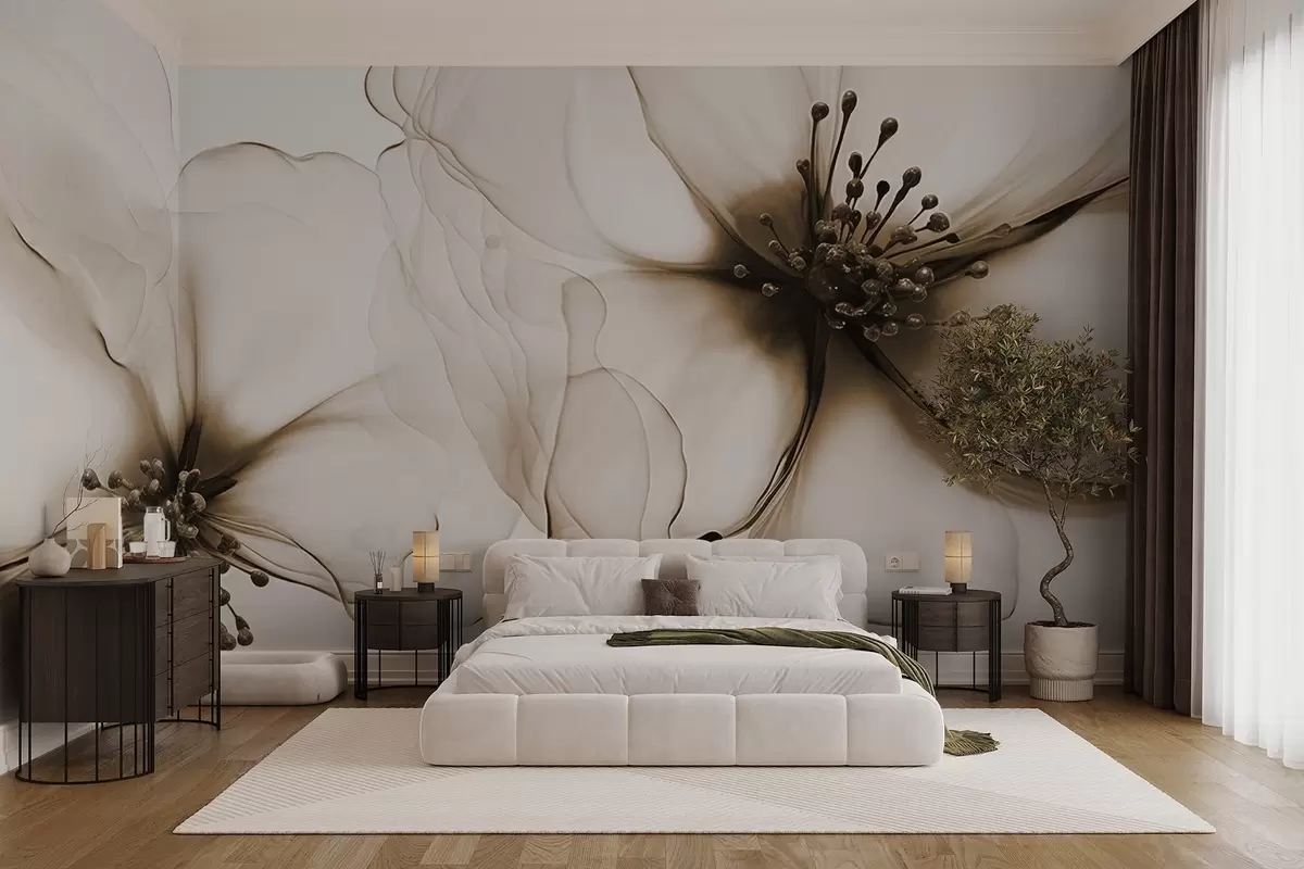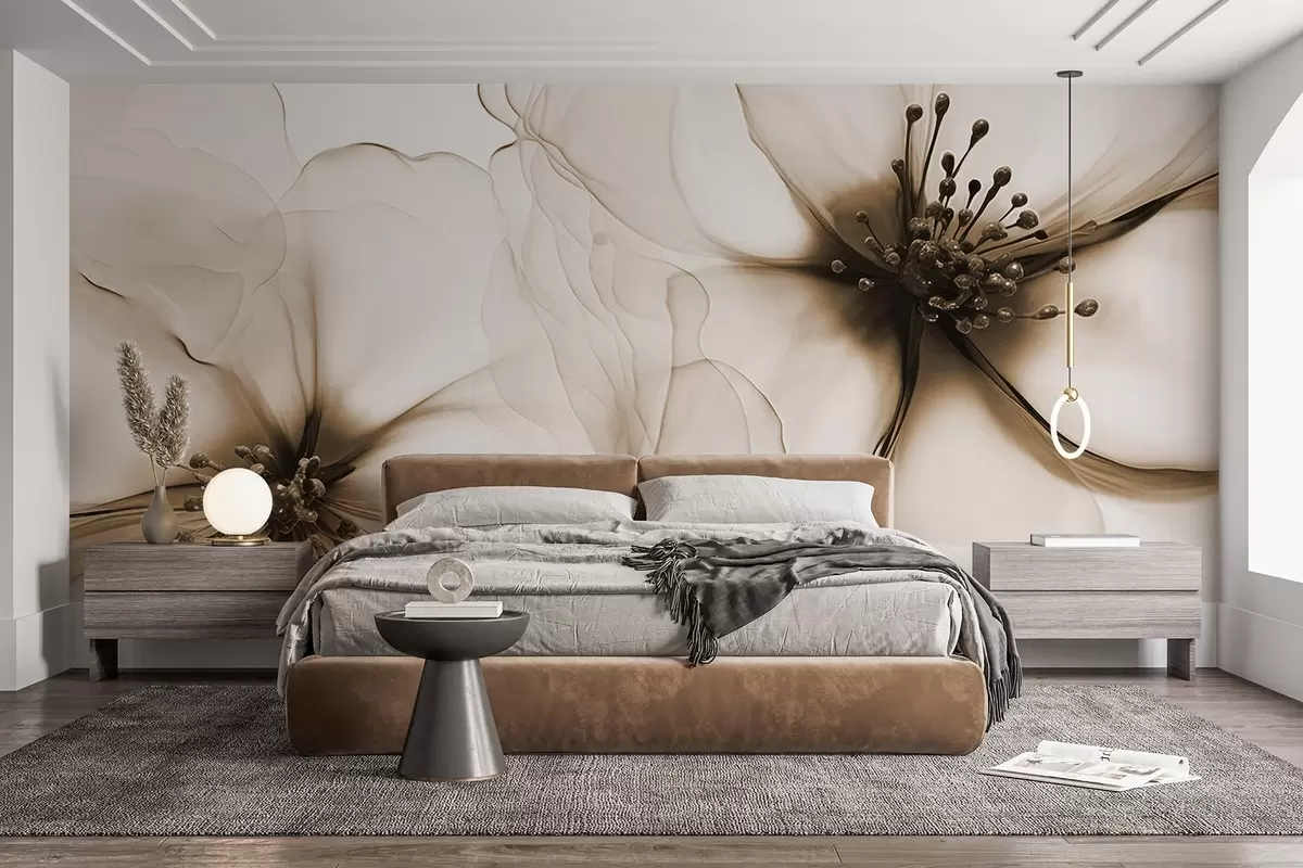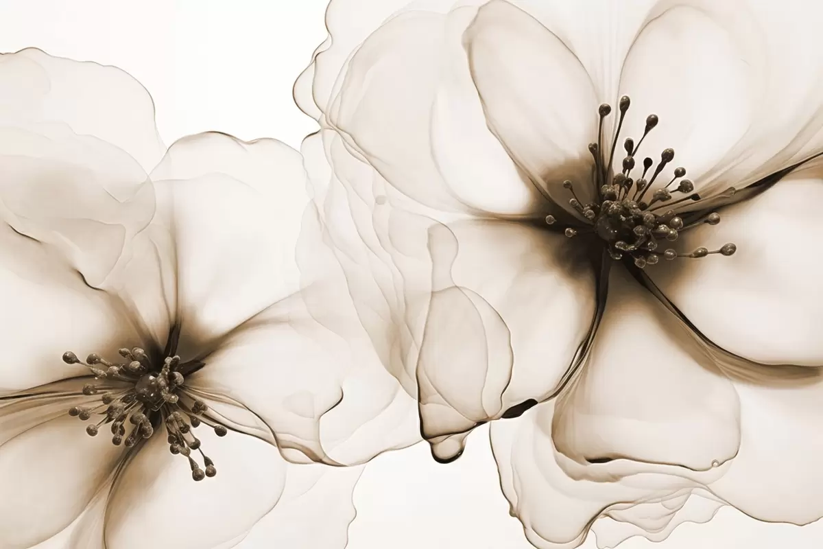 Fototapety Dva průsvitné hnědé květy s viditelnými tyčinkami, překrývajícími se jemnými okvětními lístky a jemnou splývavou strukturou Č. w09295