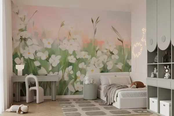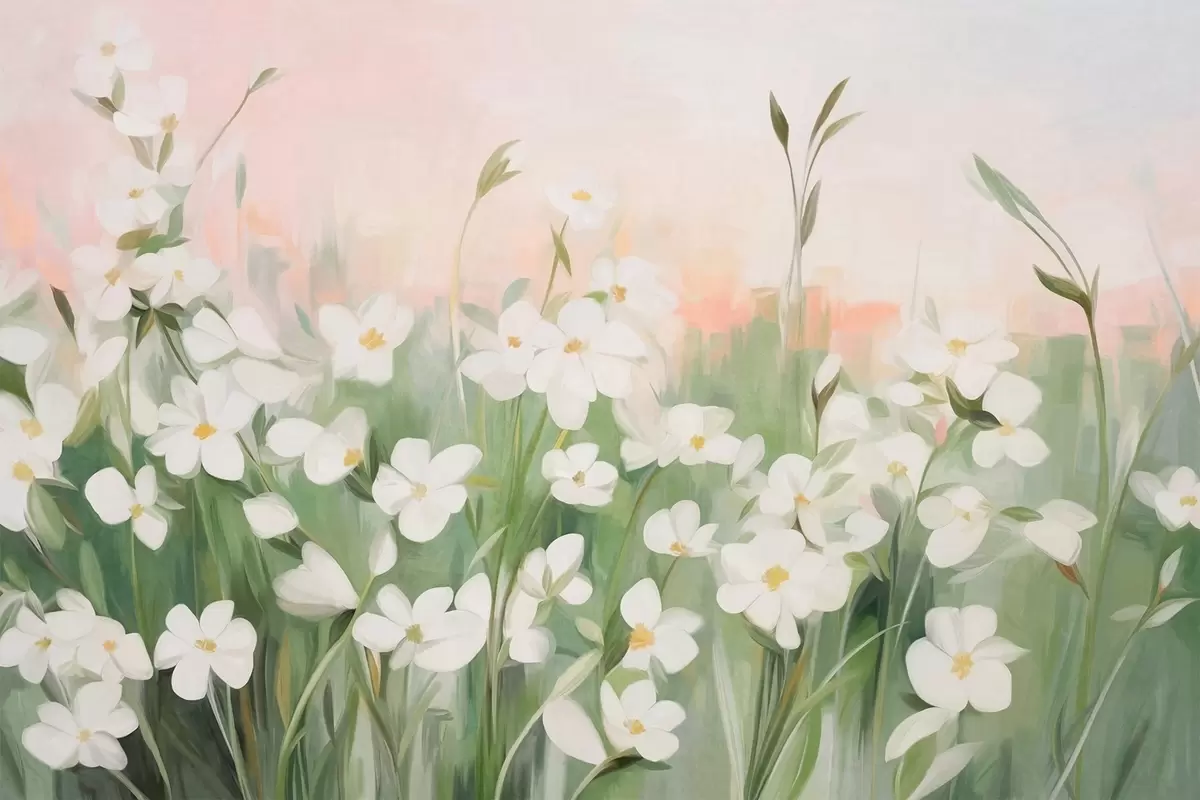 Fototapety Abstraktní pole divokých květin se zelenými stonky a listy na pozadí jemně růžové a bílé texturované oblohy. Č. w09297