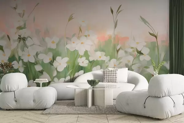 Fototapety Abstraktní pole divokých květin se zelenými stonky a listy na pozadí jemně růžové a bílé texturované oblohy. Č. w09297