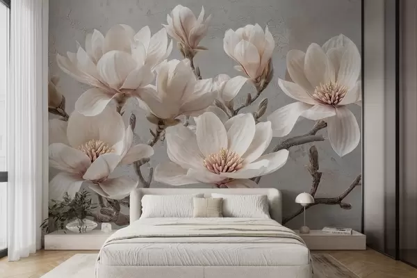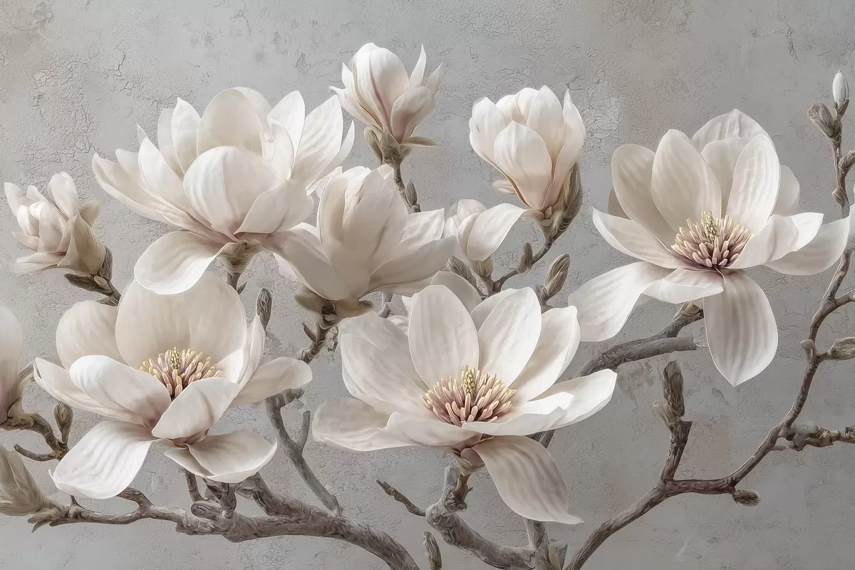Fototapety Větve magnólie s velkými světlými květy v tlumených tónech Č. w09305