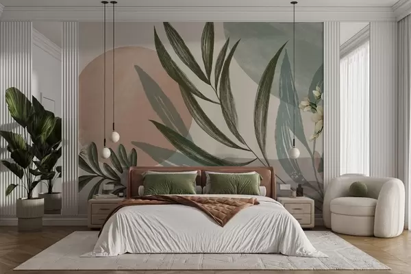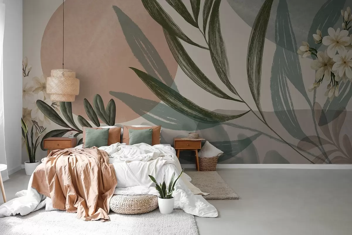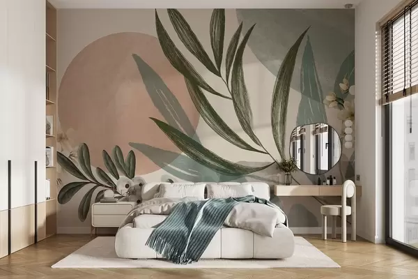 Fototapety Abstraktní botanické umění se zelenými palmovými listy a bílými bobulemi na pozadí tvarů v tlumených zemitých tónech Č. w09312