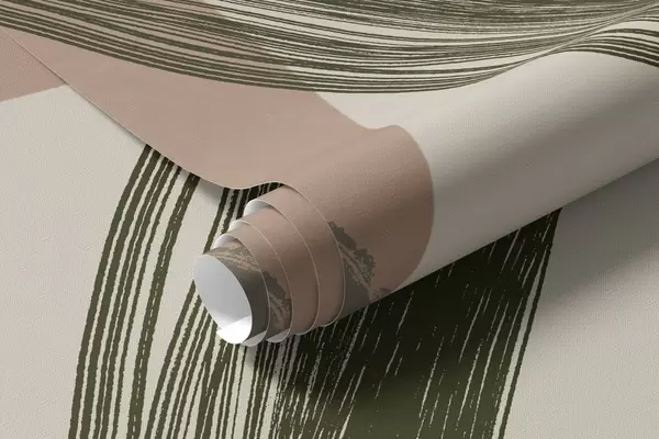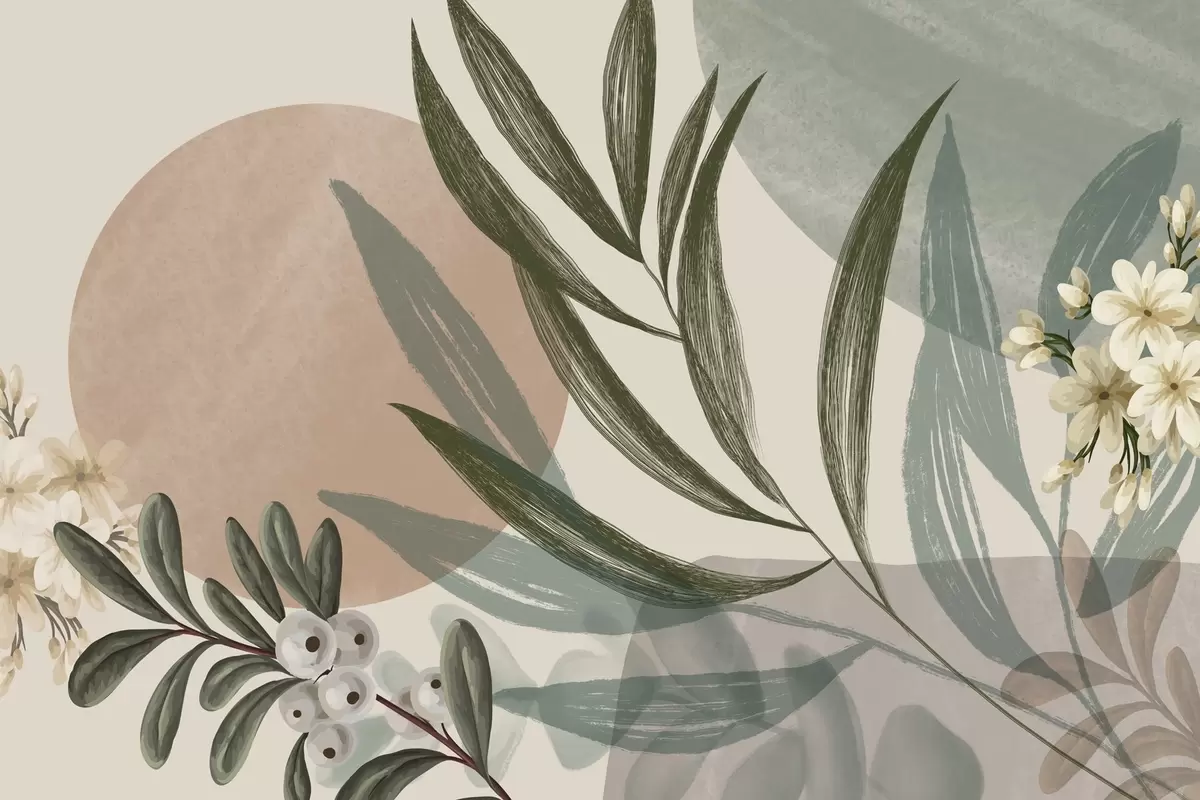 Fototapety Abstraktní botanické umění se zelenými palmovými listy a bílými bobulemi na pozadí tvarů v tlumených zemitých tónech Č. w09312