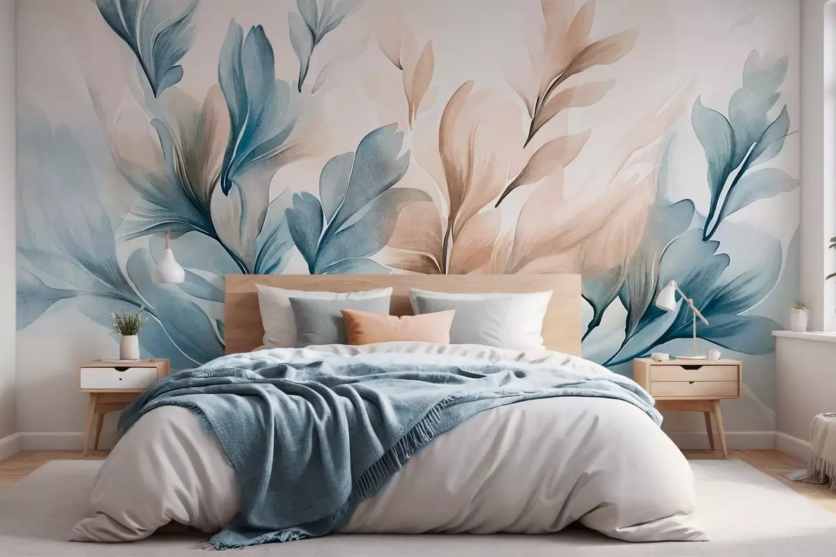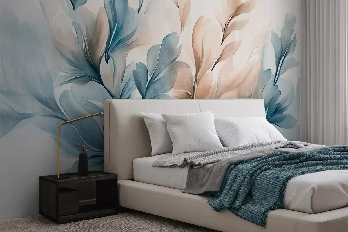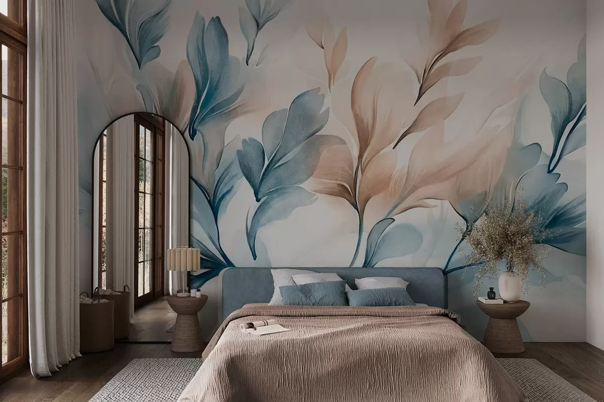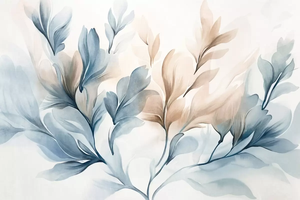Fototapety Modré a hnědé abstraktní listy s viditelnými tahy štětce , lehké a texturované, jemná barevná paleta, akvarelový efekt Č. w09313