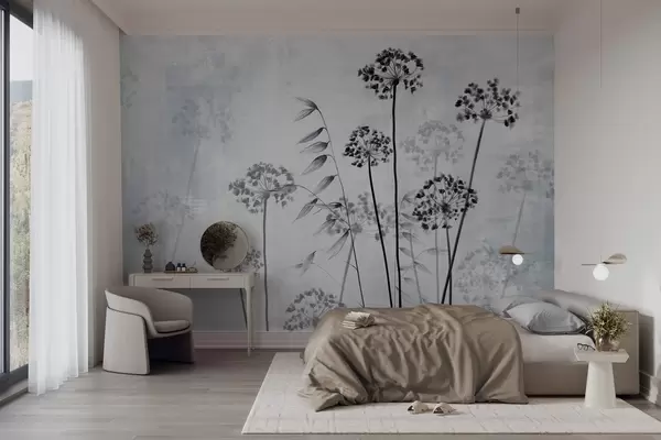 Fototapety Kresba sušených květin s dlouhými stonky, černobílá paleta, na texturovaném, světle šedém pozadí, botanická ilustrace Č. w09314