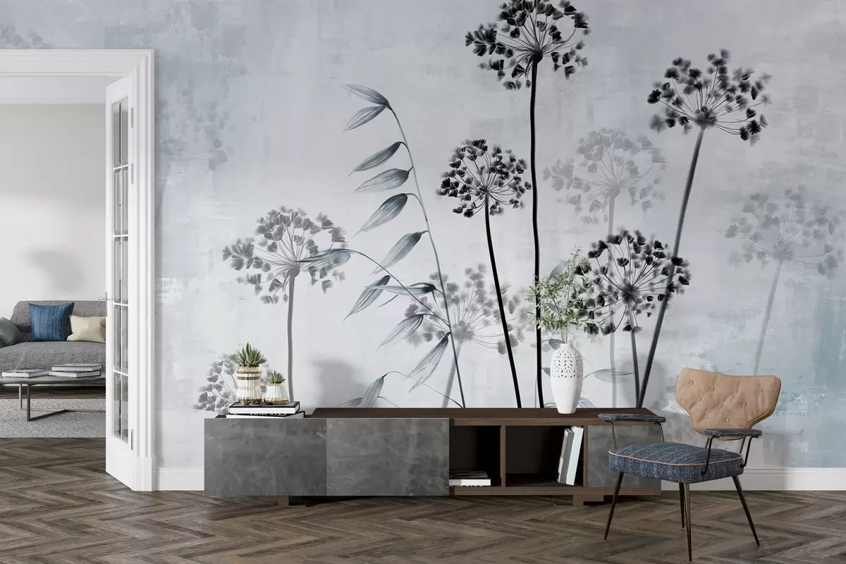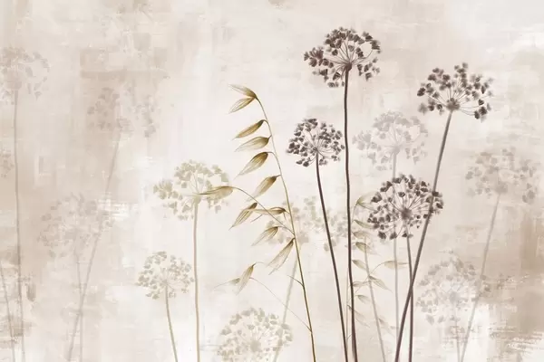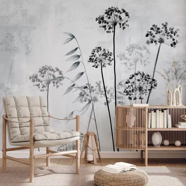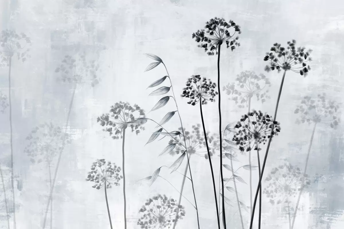 Fototapety Kresba sušených květin s dlouhými stonky, černobílá paleta, na texturovaném, světle šedém pozadí, botanická ilustrace Č. w09314