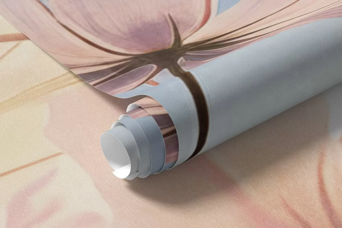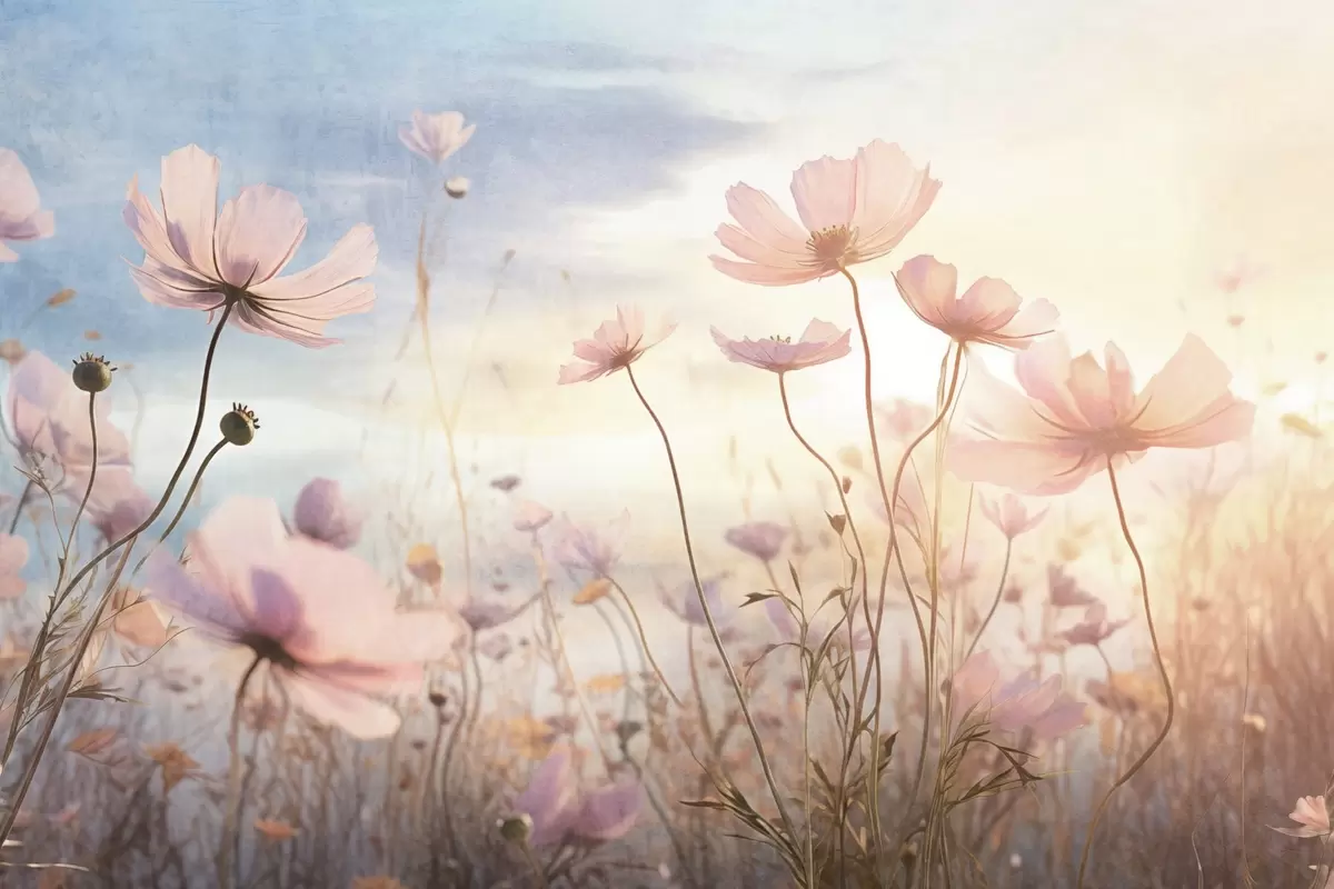 Fototapety Pole růžových květů s dlouhými stonky na pozadí jemné modré a žluté oblohy, které vytváří snovou atmosféru Č. w09320