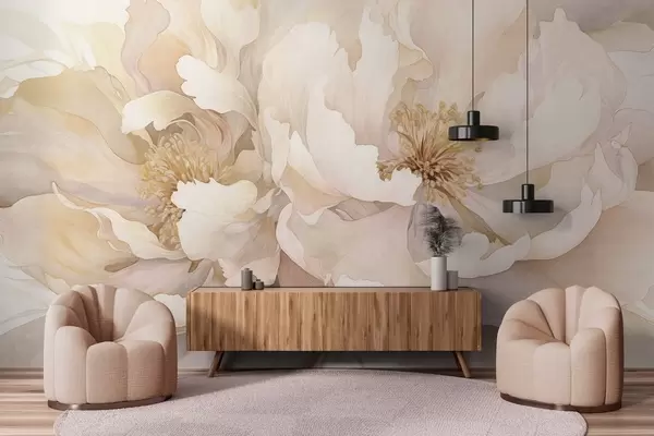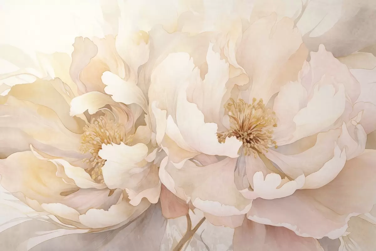 Fototapety Květy pivoňky s jemnými okvětními lístky v odstínech krémové broskvové a světle růžové s jemnou, akvarelovou strukturou Č. w09321